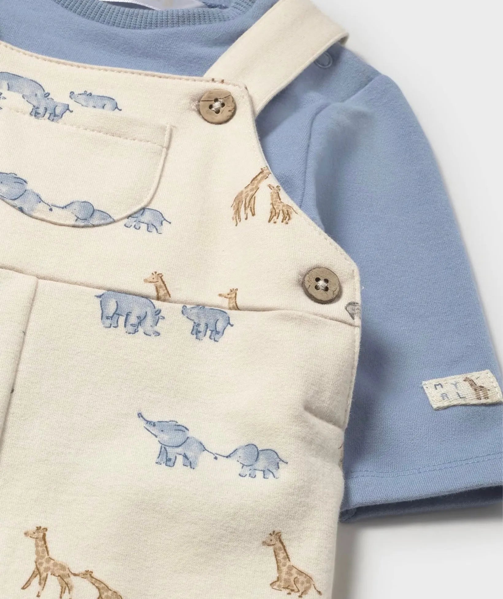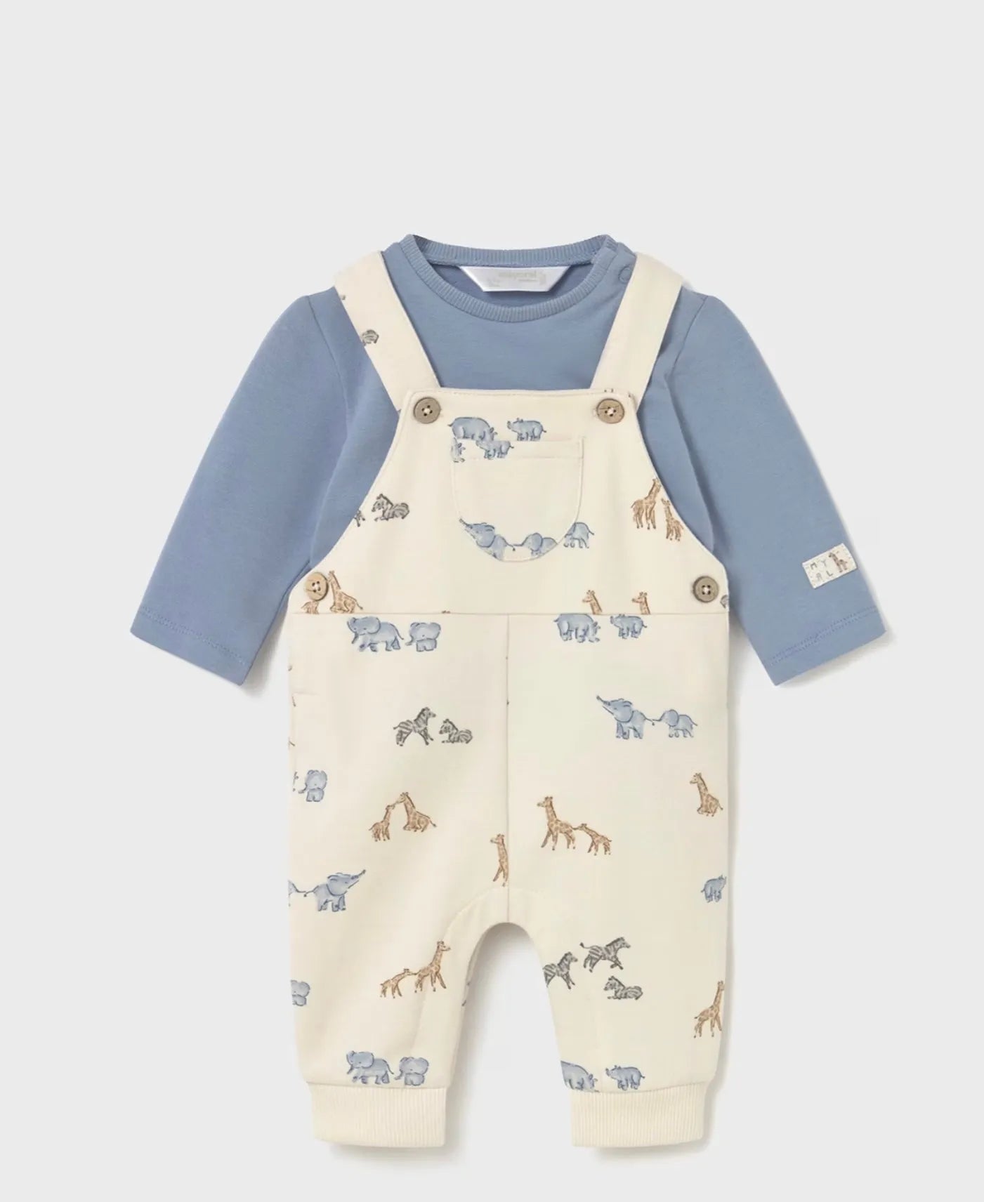 This adorable set features a patterned dungaree with stylish suspenders and a matching T-shirt. The baby boy outfit includes snap buttons at the crotch, making diaper changes quick and hassle-free. Perfect for easy dressing and everyday comfort.