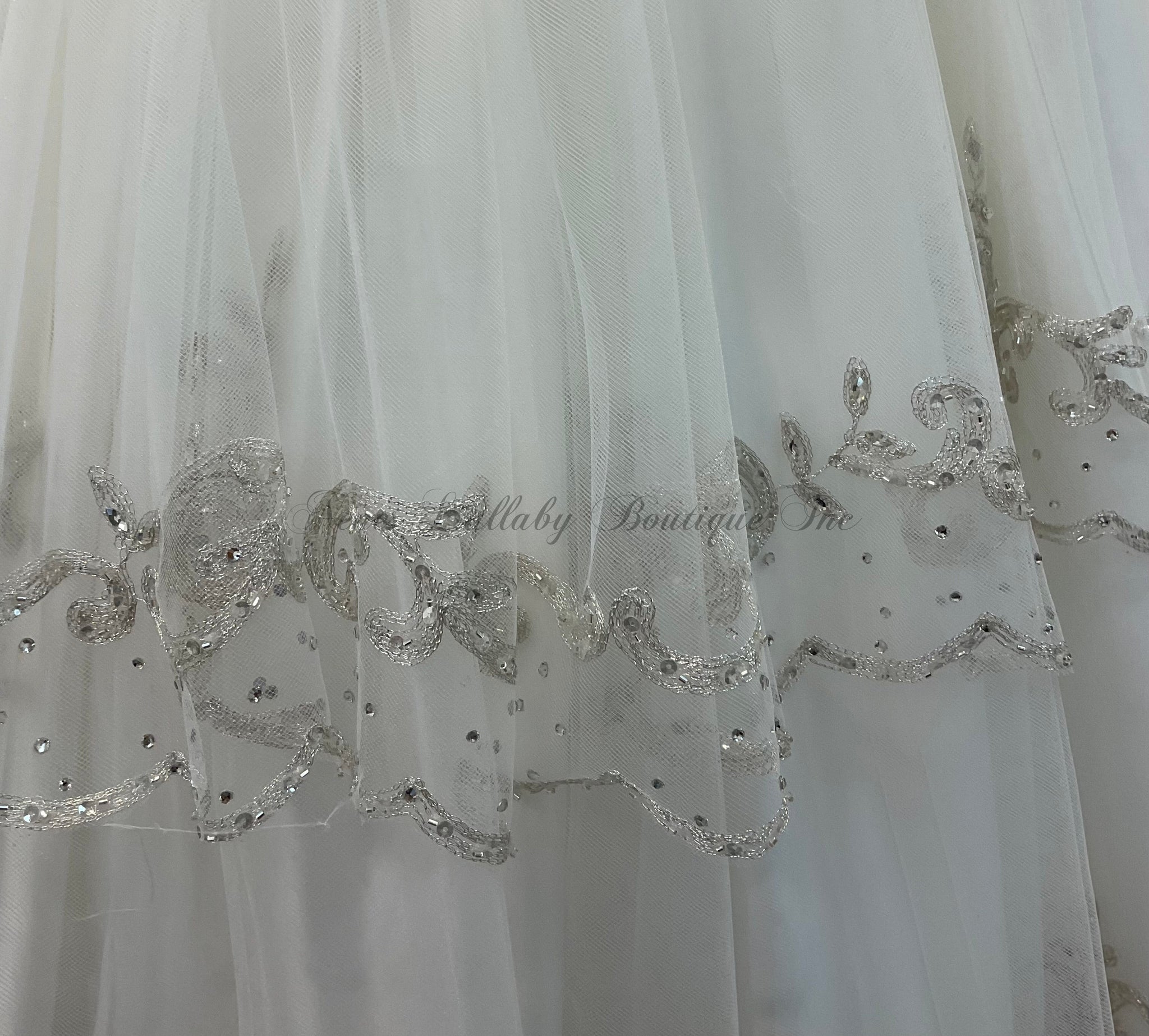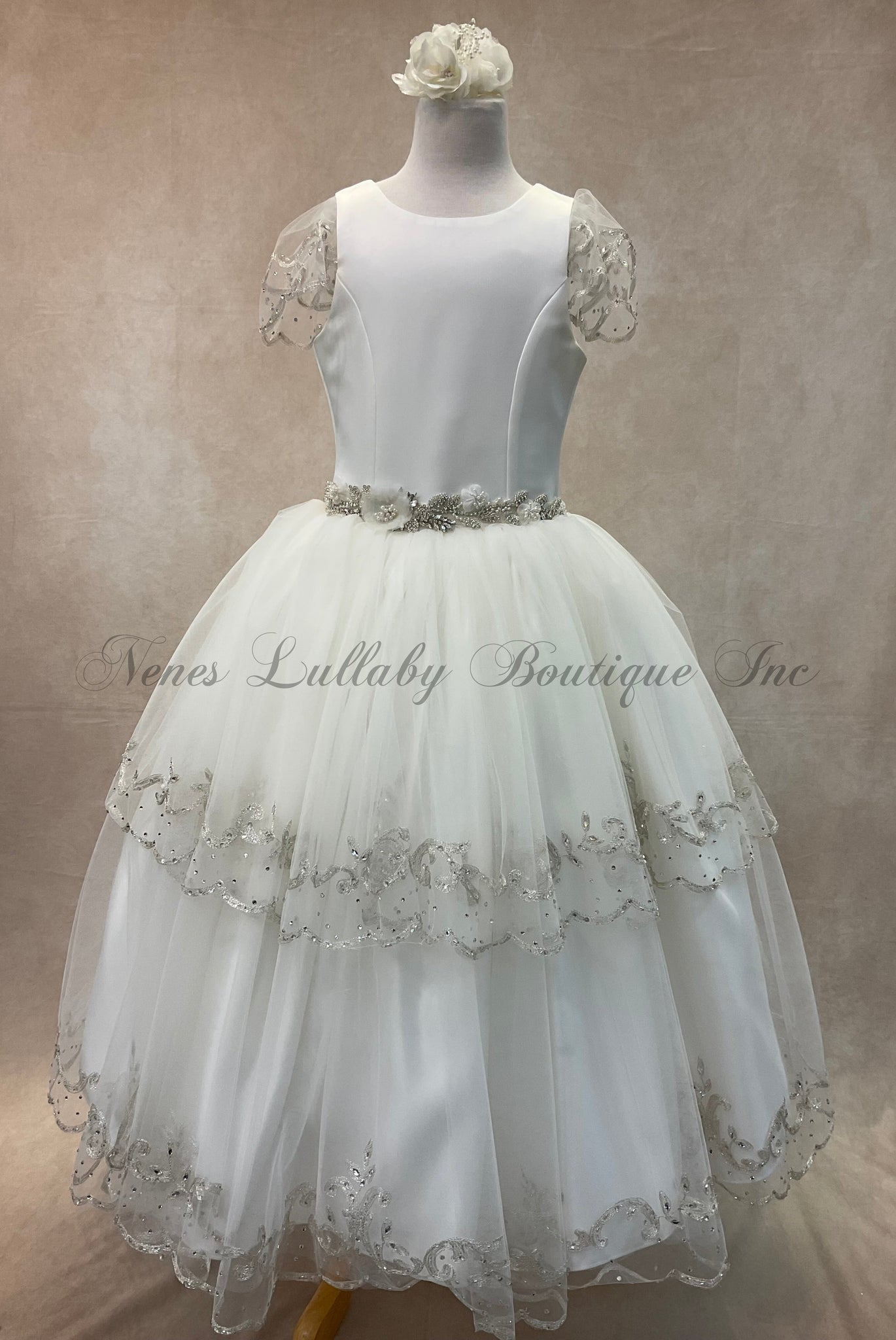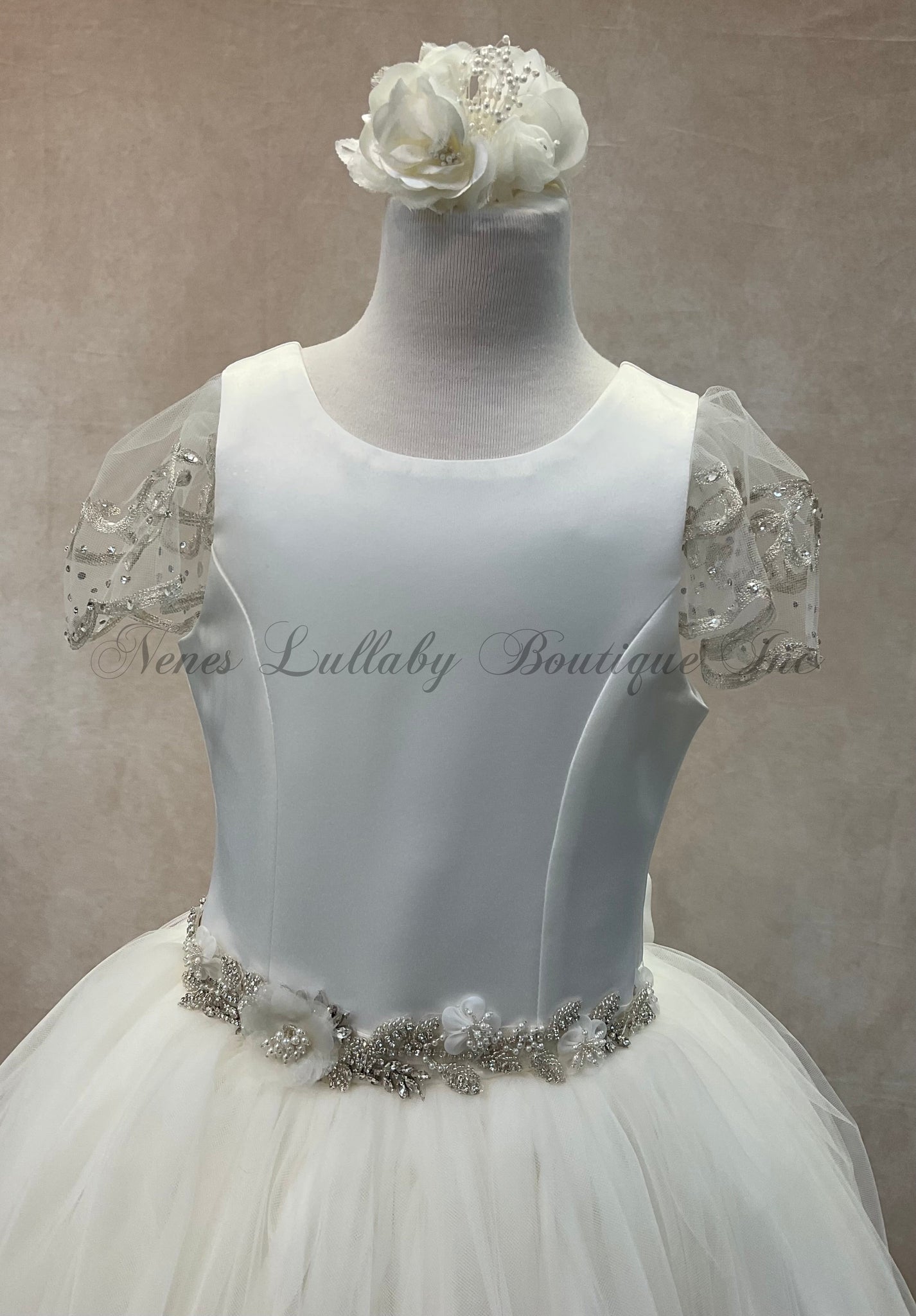 The Elenor Communion Dress by Bella Bow is a diamond white couture dress featuring a 2-tier embroidered skirt and cap sleeves.