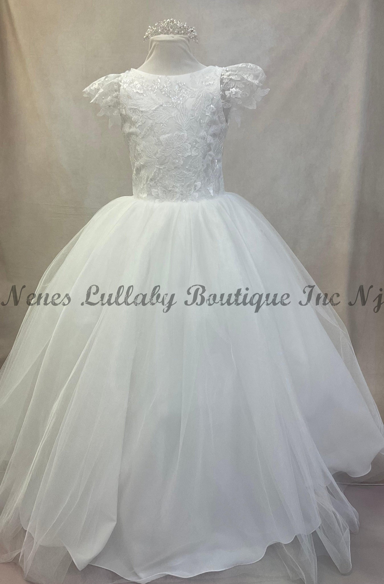 Crafted for special occasions, the Evie Communion dress features an elegant Pearl white lace bodice with delicate flutter sleeves that frame the shoulders beautifully. The design transitions to a voluminous tulle skirt that flows to full length, creating a graceful silhouette perfect for flower girls and communion celebrations. This timeless piece combines refined details with comfortable construction for a memorable day.