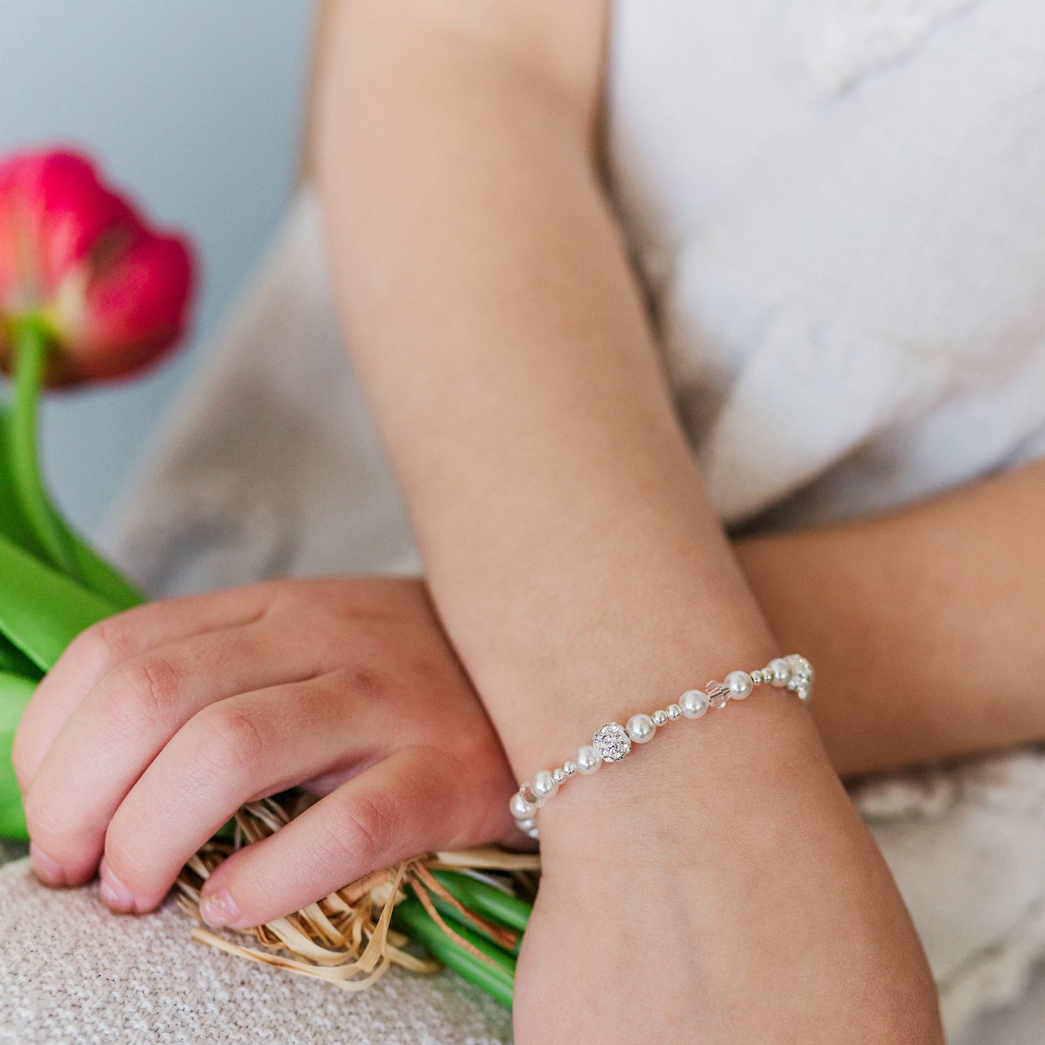 NEW! This keepsake bracelet is made with high-end white simulated pearls and crystals, with sparkling stardust beads! Fun gift for flower girls, recital gift, birthdays or just because. This high quality bracelet has an extension chain so as the child grows you just move to the next link for a perfect fit. Available in three sizes and is great for infants, babies, toddlers, and kids. This bracelet comes in a beautiful gift box. Hand made in the USA!