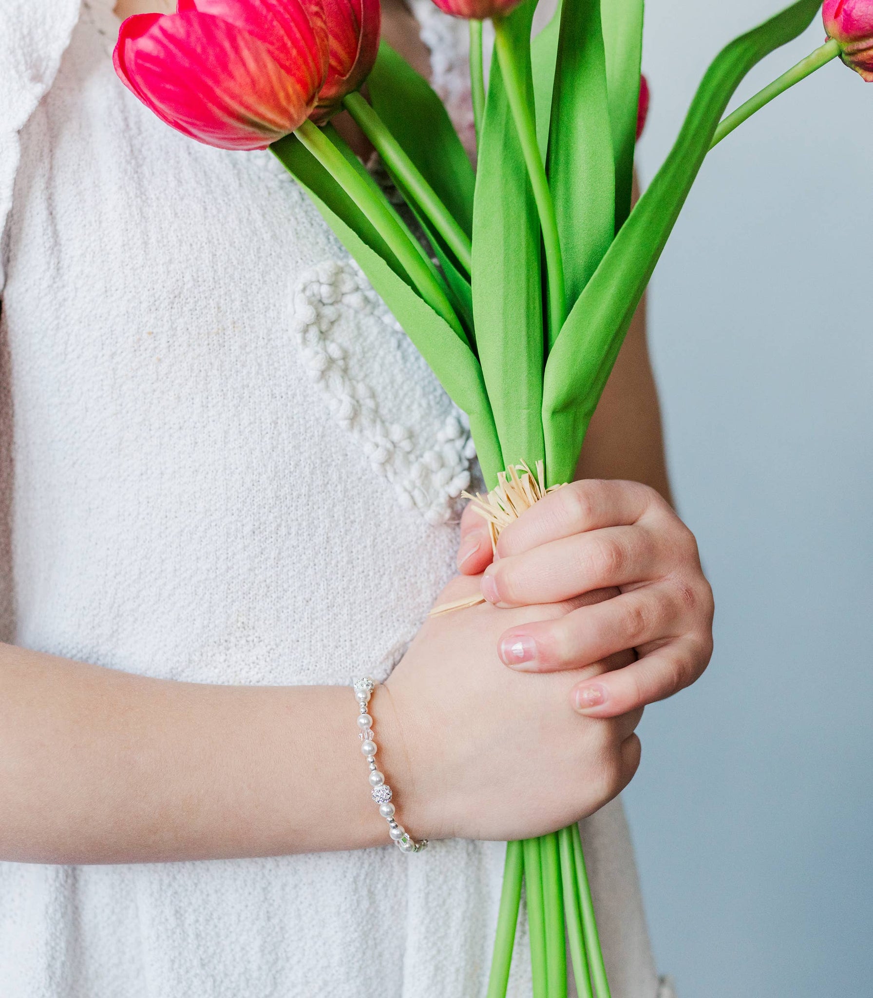 NEW! This keepsake bracelet is made with high-end white simulated pearls and crystals, with sparkling stardust beads! Fun gift for flower girls, recital gift, birthdays or just because. This high quality bracelet has an extension chain so as the child grows you just move to the next link for a perfect fit. Available in three sizes and is great for infants, babies, toddlers, and kids. This bracelet comes in a beautiful gift box. Hand made in the USA!