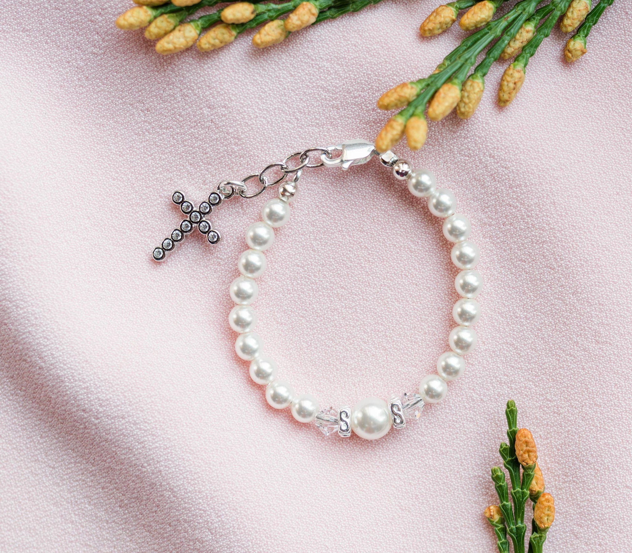 Children's sterling silver bracelet featuring beautiful high-end Austrian simulated pearls and crystals with sparkling silver rondelle accents and dainty cross charm with CZ stones. Perfect gift for baby baptism, dedication, christening, and first communion gift. This cross bracelet comes in a beautiful gift box. "A keepsake she will cherish Forever" This jewelry is hand-made in the USA.
