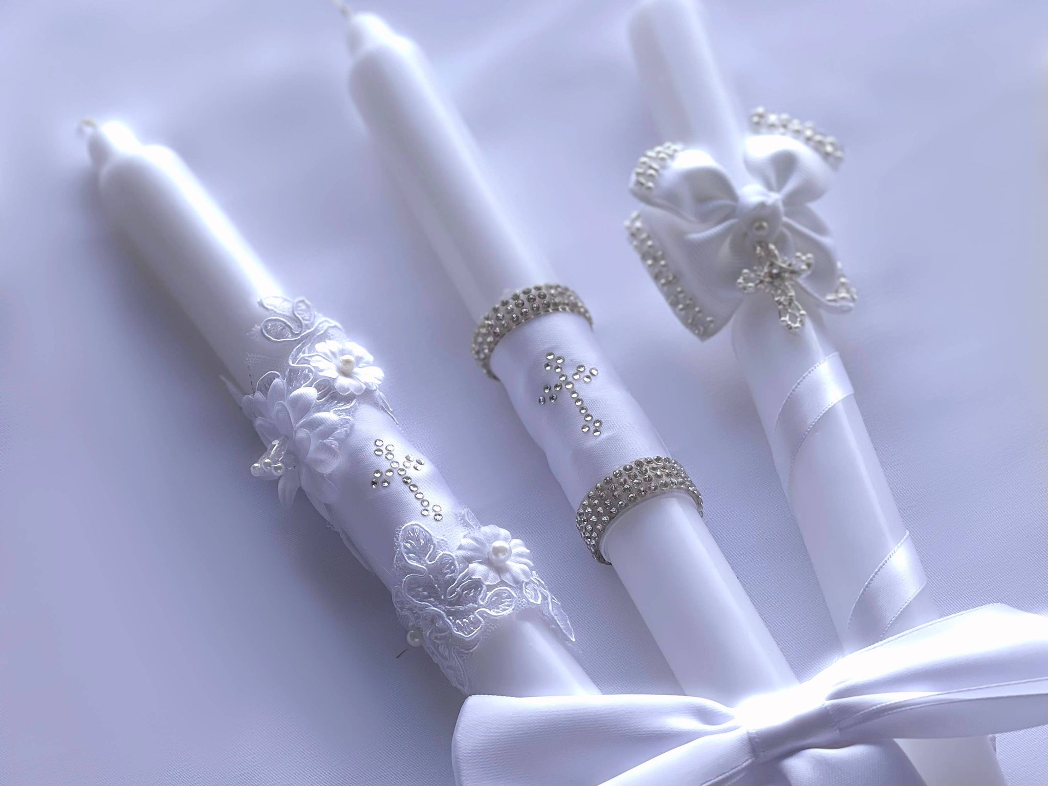 White candles for Baptisms, Christenings and First Communions. Comes in assorted styles and boxed individually. Measures 12"x1" Made in the USA