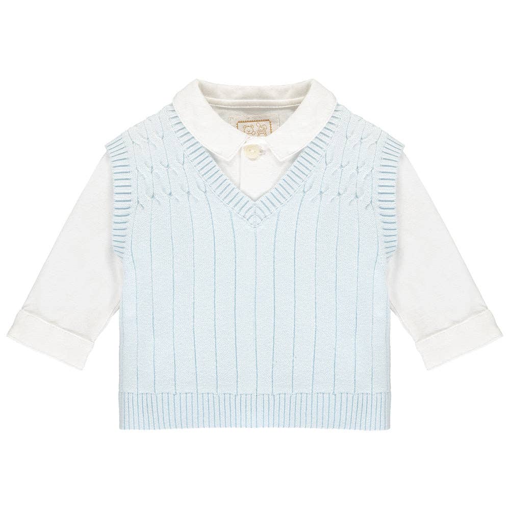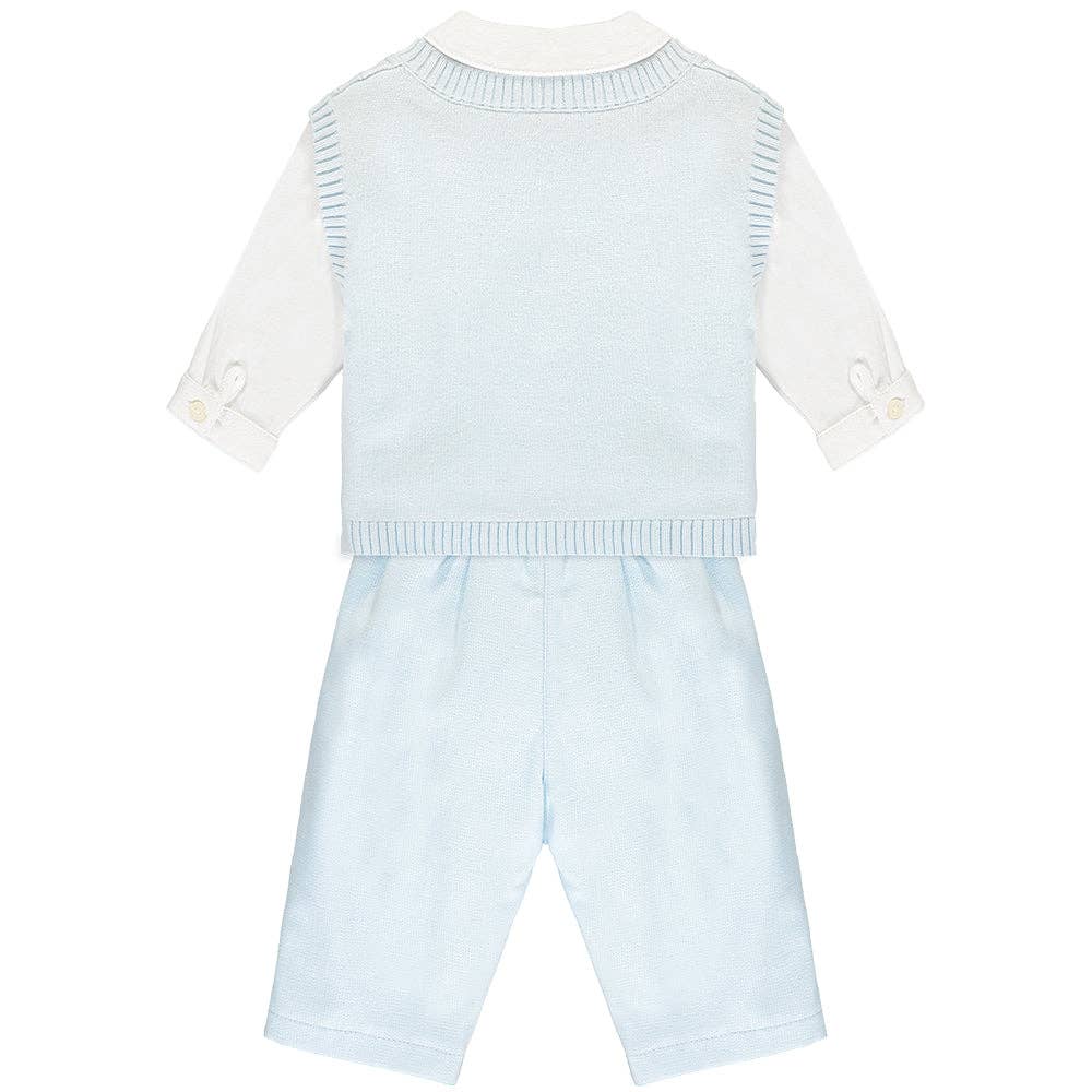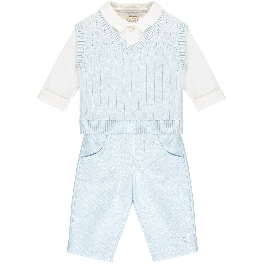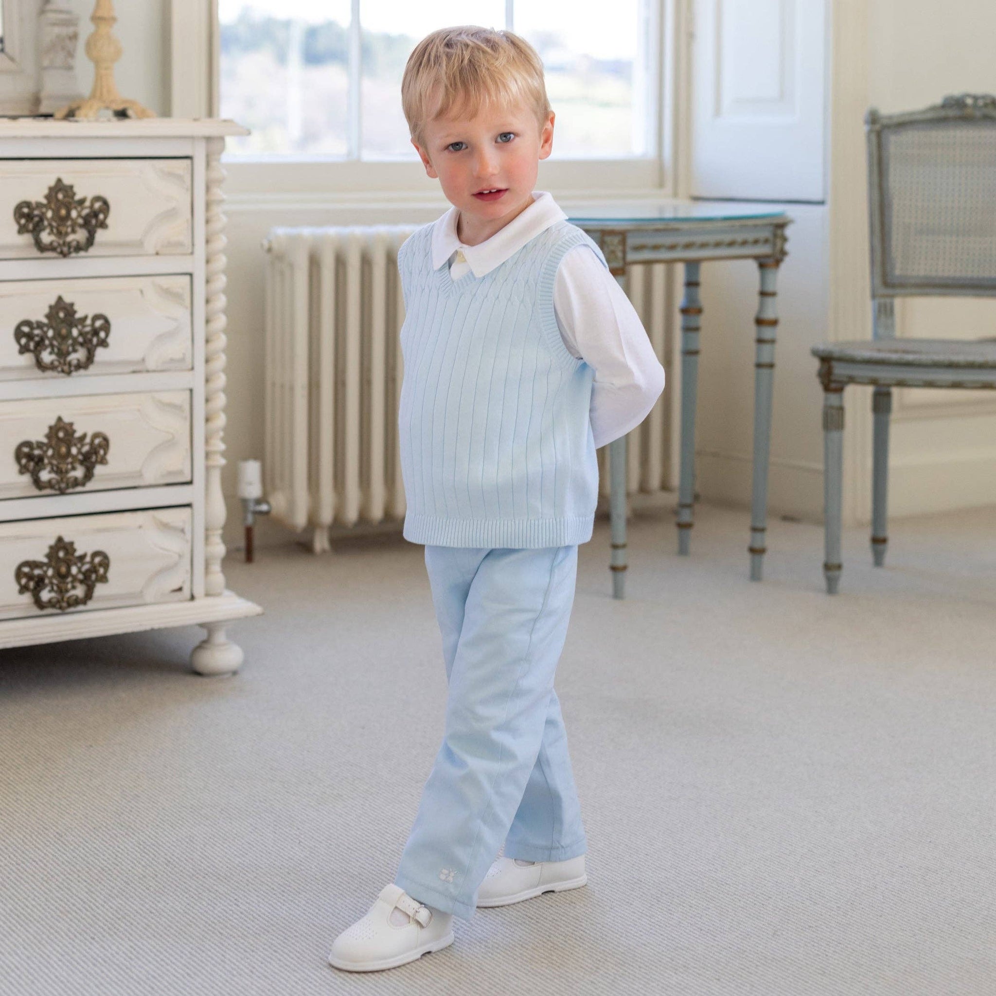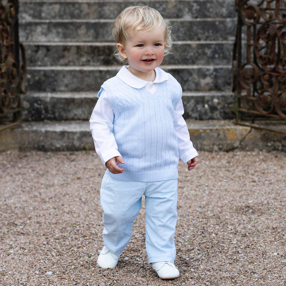 A smart and traditional outfit for boys, Gulliver in blue is a full three piece outfit perfect for special occasions. The set consists of a smart white button up shirt, fine knit tank top and cord trousers that are fully lined in jersey. A popular outfit that is also available in ivory. Finer Details: * Pearlised full-length opening to the shirt * Long sleeves * Classic knit tank top * Soft woven trousers * Available up to age 4
