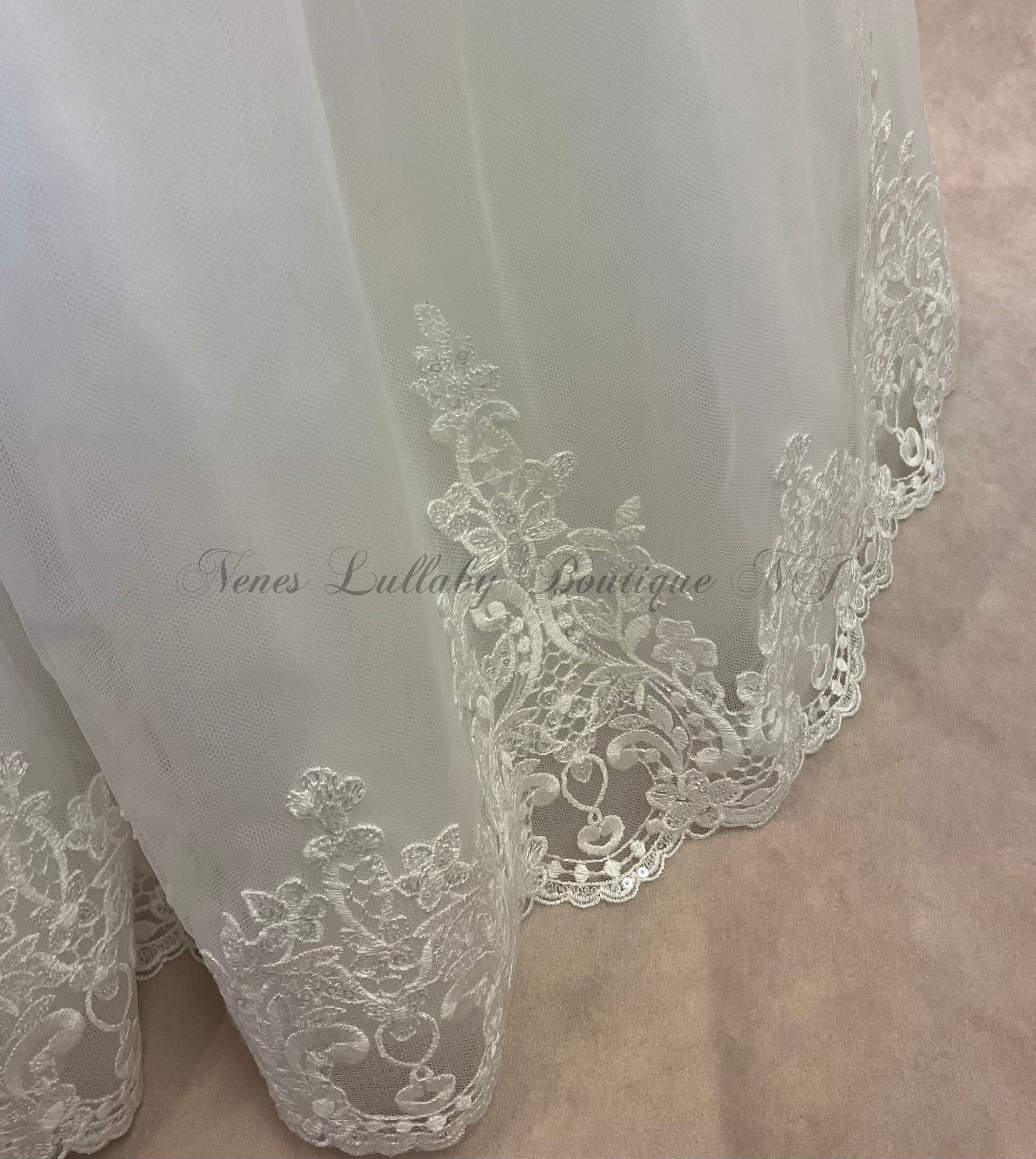 This elegant and classic christening gown is crafted from taffeta and features a layer of tulle with delicate lace trim along the hem. The bodice is adorned with a hand-rolled flower and delicate lace accents over the cap sleeves, making it a truly timeless piece. Matching bonnet included.