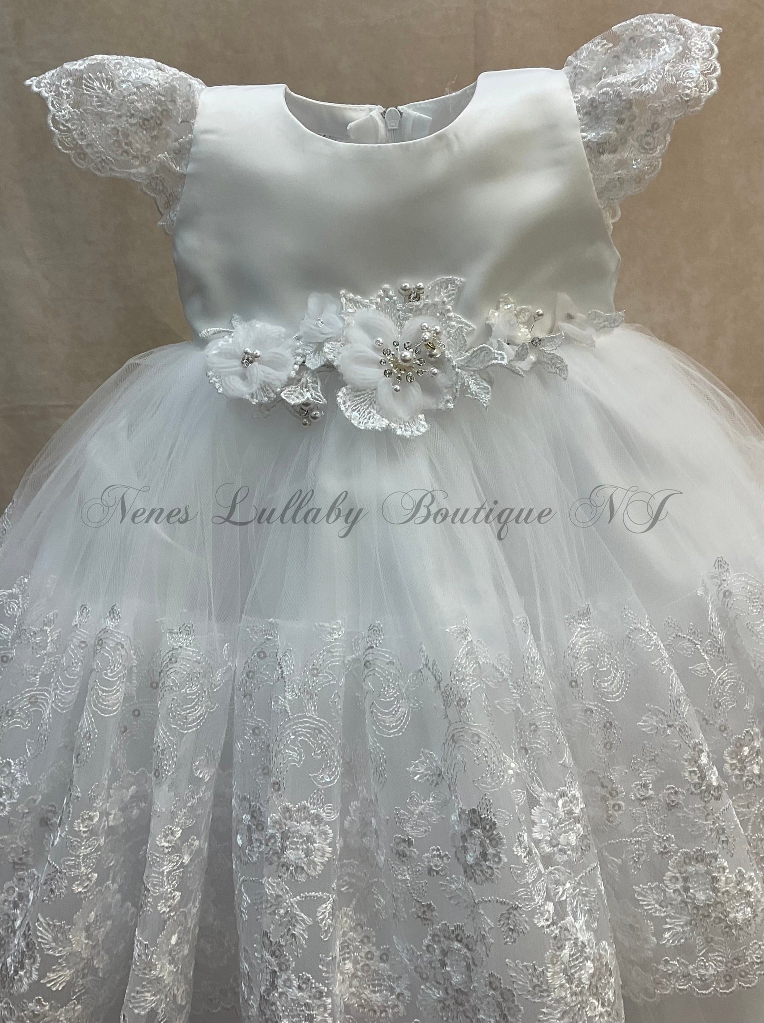 This exquisite Christening gown boasts a double lace skirt and flutter sleeves, adorned with flowers and pearls. The luxurious satin fabric adds an elegant touch, while the coordinating bonnet completes the look.