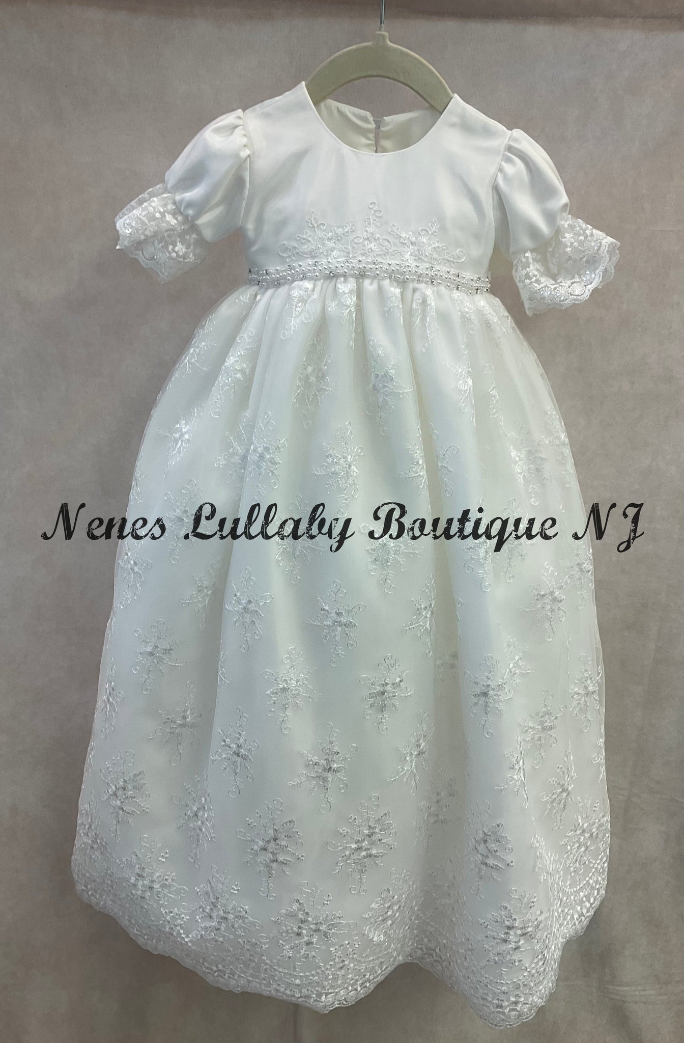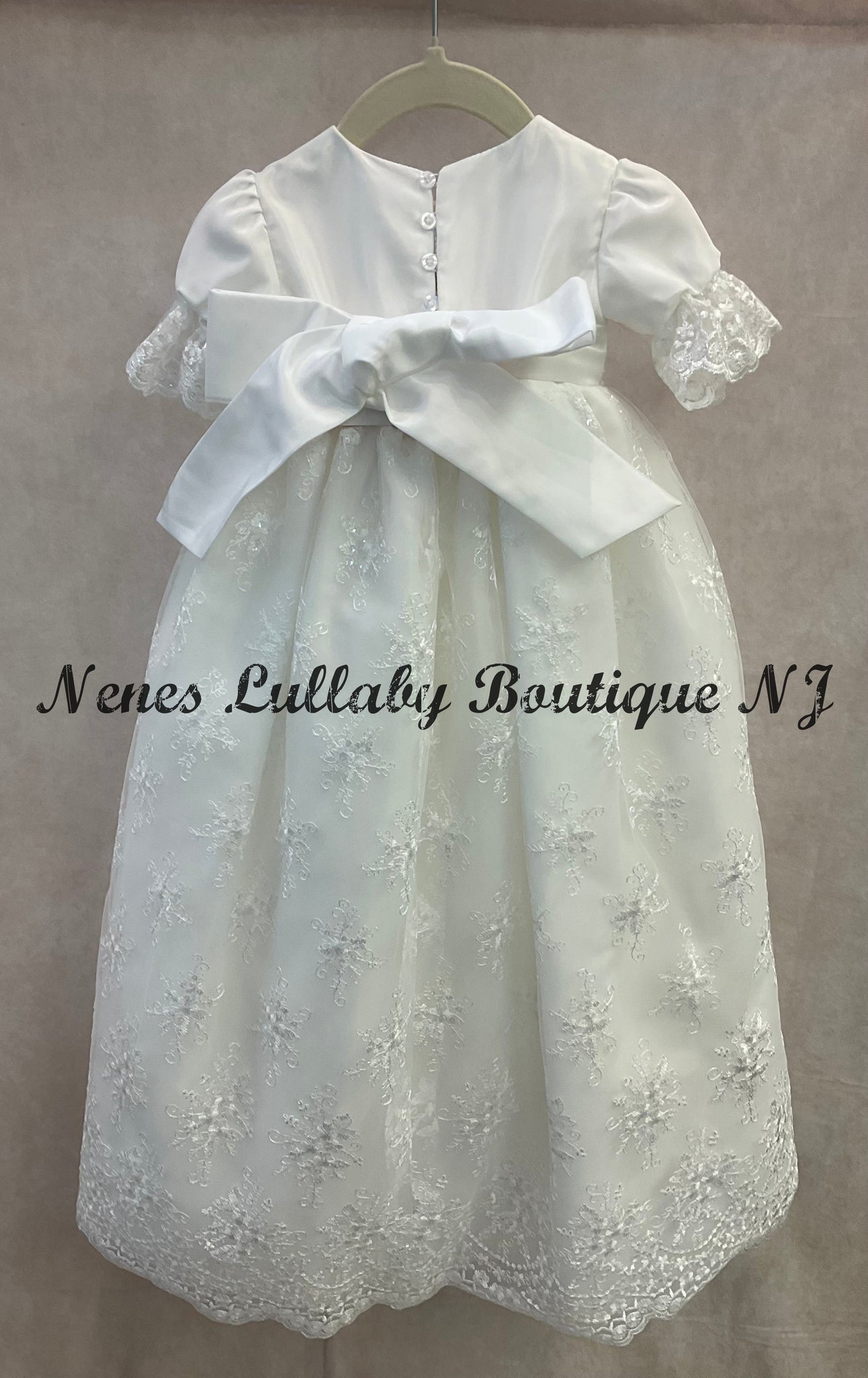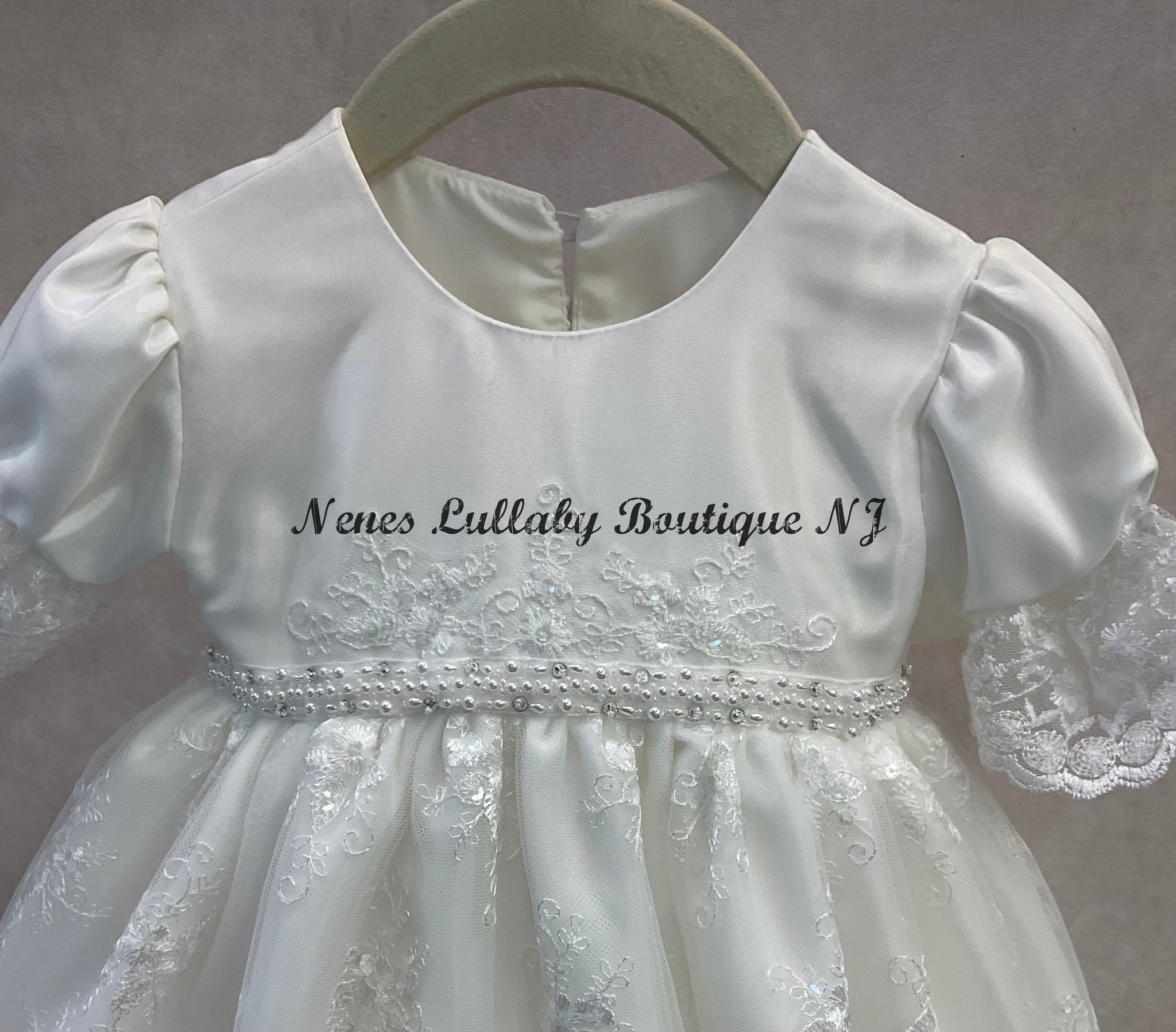 This Bernadette Christening / Baptism Gown boasts a stunning egg shell color, intricate lace skirt, beaded waistline, and a matching ruffled sheer bonnet.