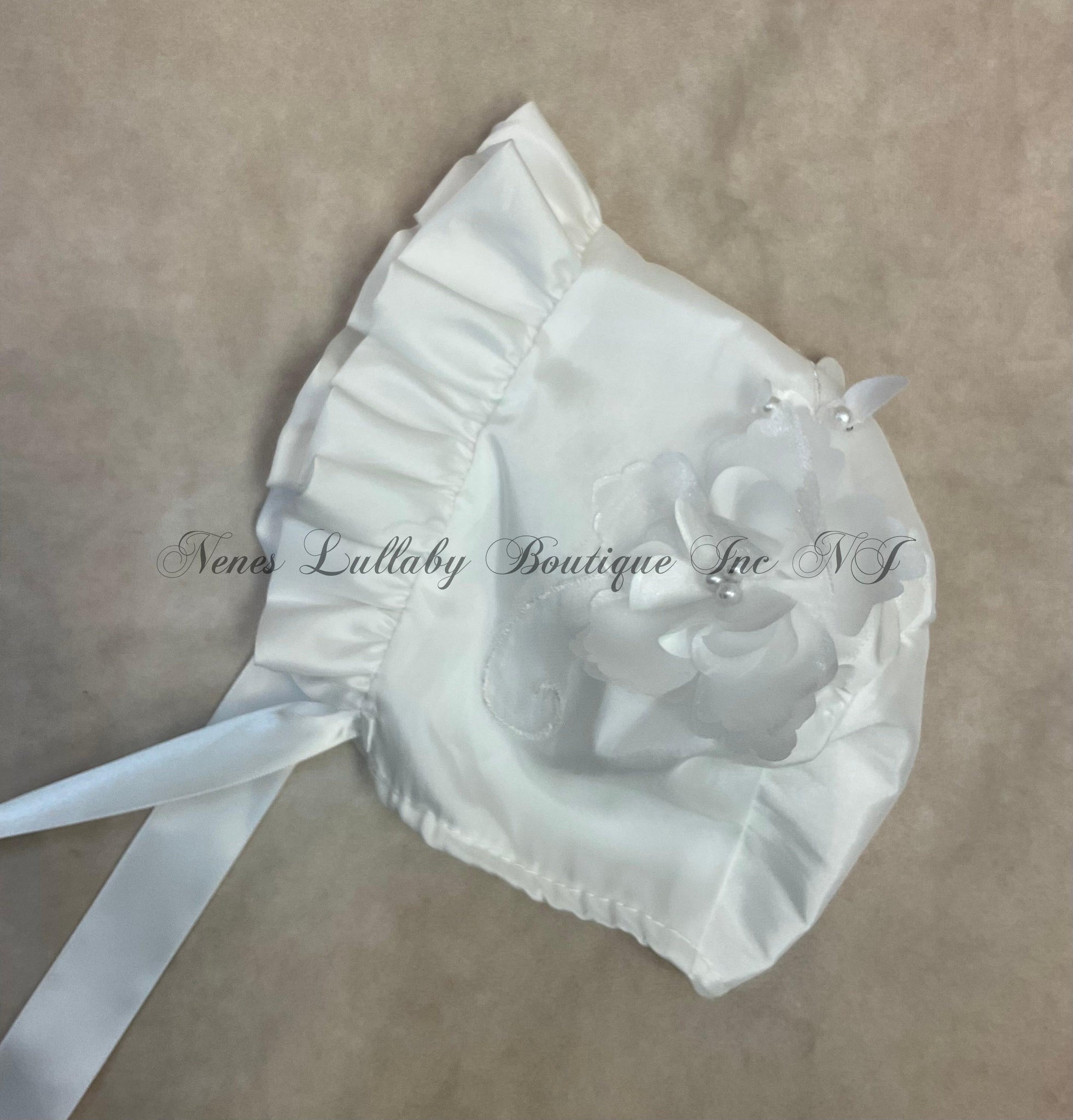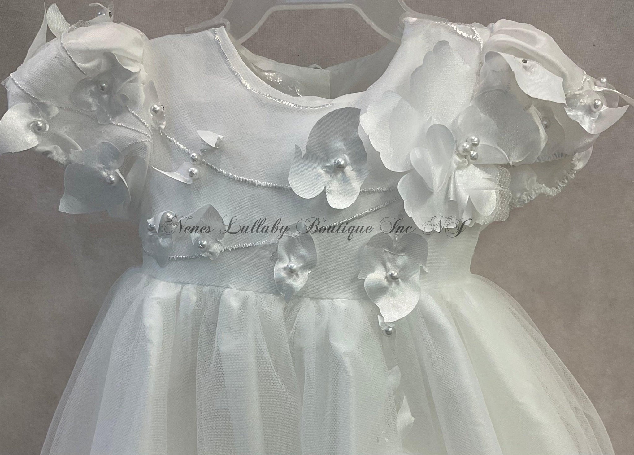 This luxurious Celine Christening / Baptism Gown features a beautiful egg shell hue, intricate 3D Floral & Pearl Lace, delicate cap sleeves, and a matching ruffle bonnet.