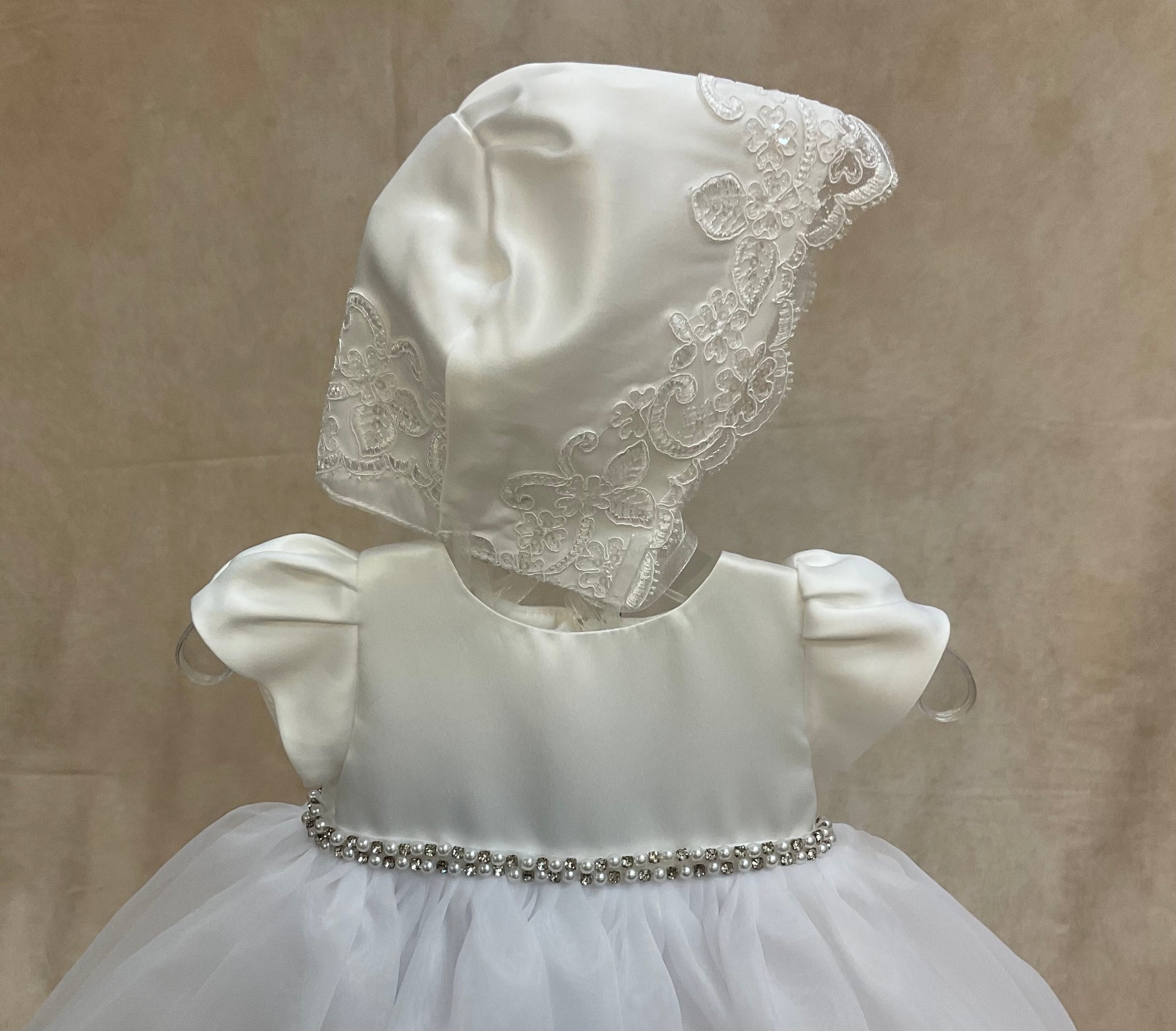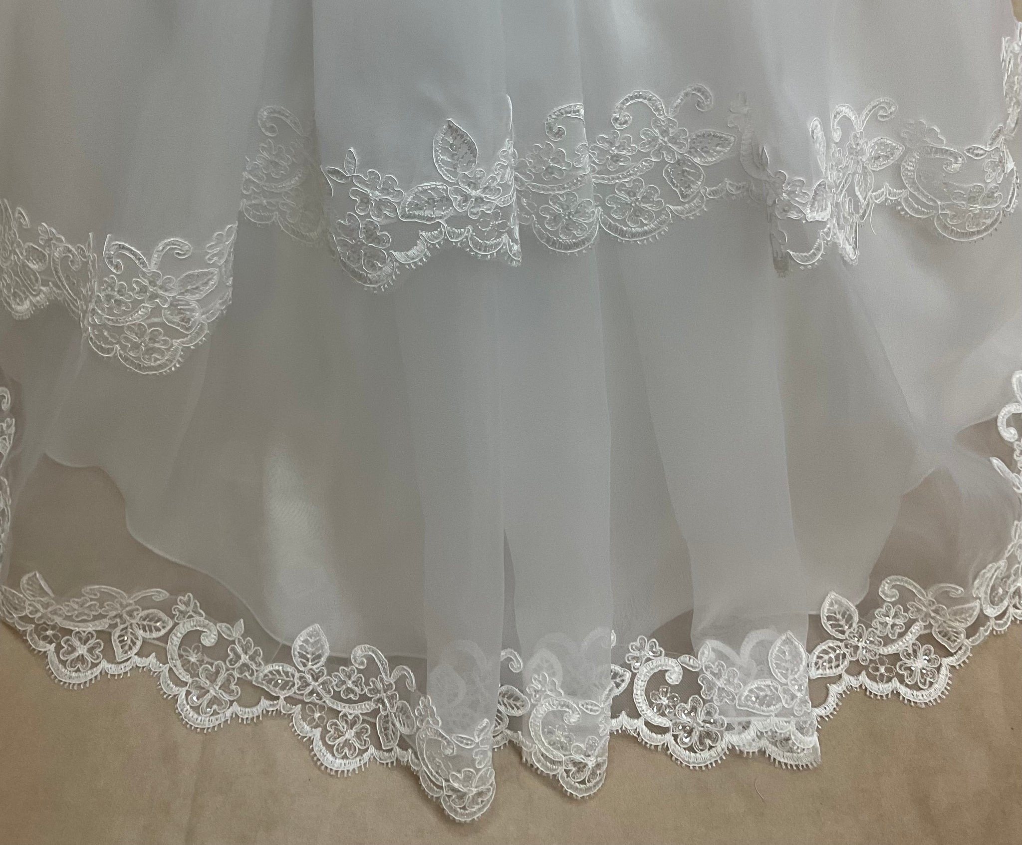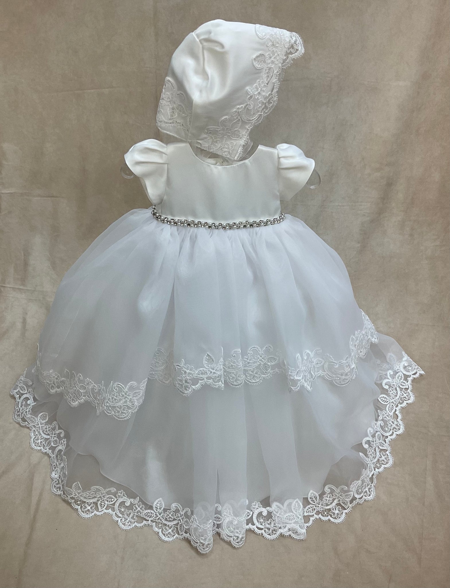 This Lili white Christening gown features a 2 tier lace skirt and satin bodice, creating an elegant and timeless look for your special occasion.