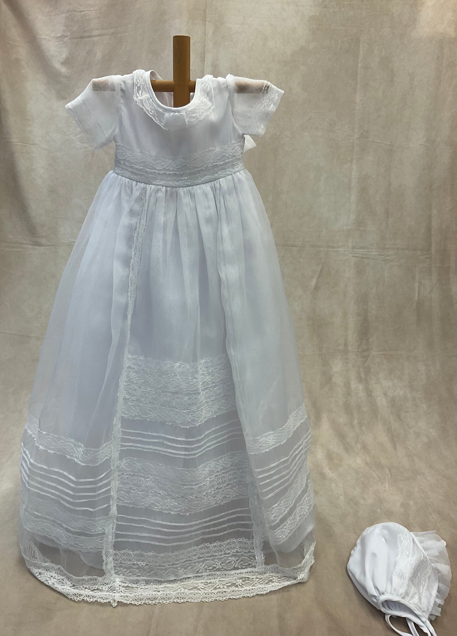 The Mae Christening Gown (White) is a timeless, heirloom-quality garment designed to be treasured for years to come. It is meticulously crafted with a cotton and satin underlay and adorned with an ethereal organza overlay featuring delicate lace trims and elegant piping. The dress fastens at the back and is accompanied by a matching ruffled bonnet.