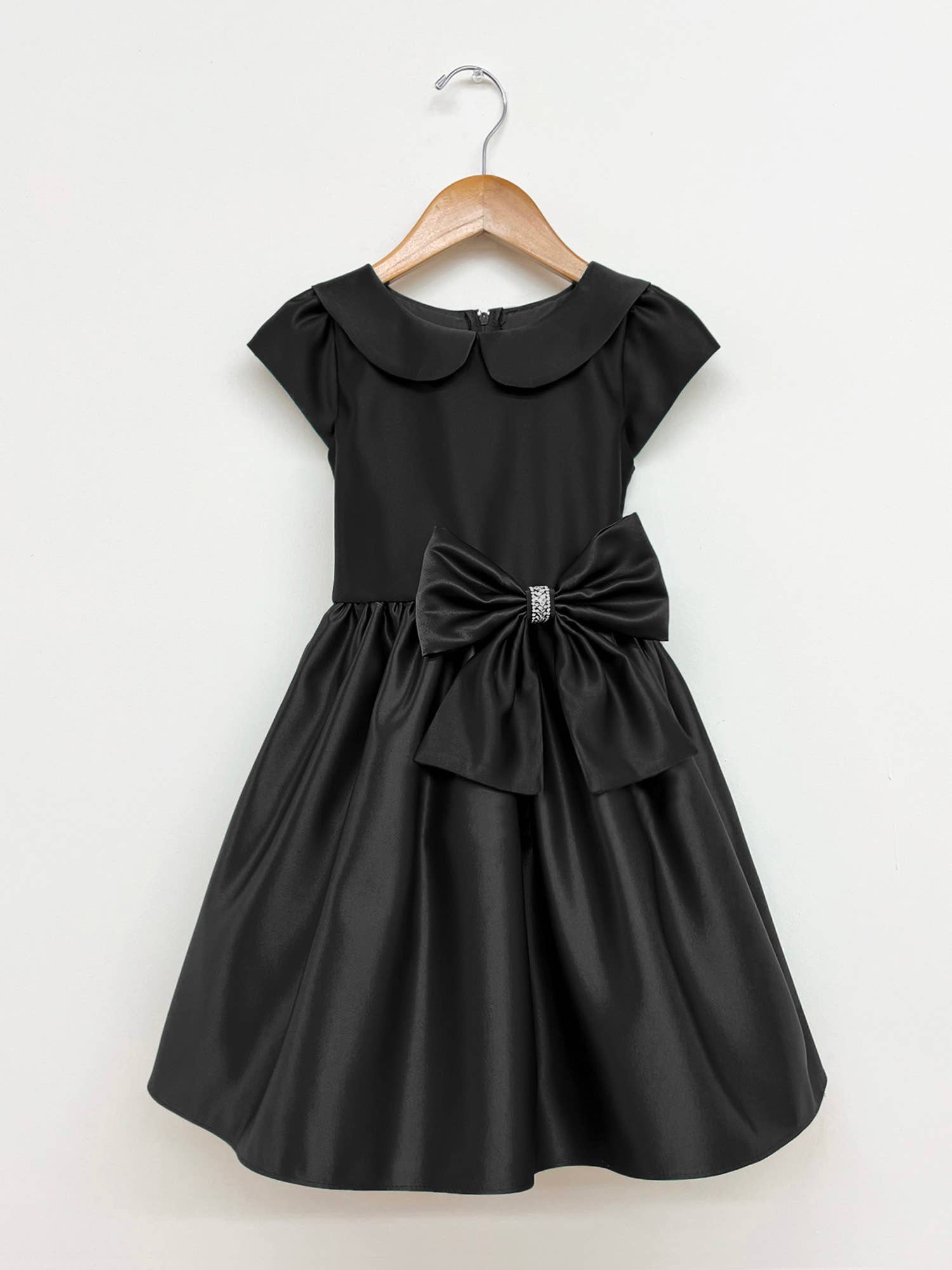 Satin dress with cap sleeves, collar at the neckline, gathered waist and an oversized bow at the side waist with a rhinestone detail center. Satin back belt and zipper for closure. Knee length.