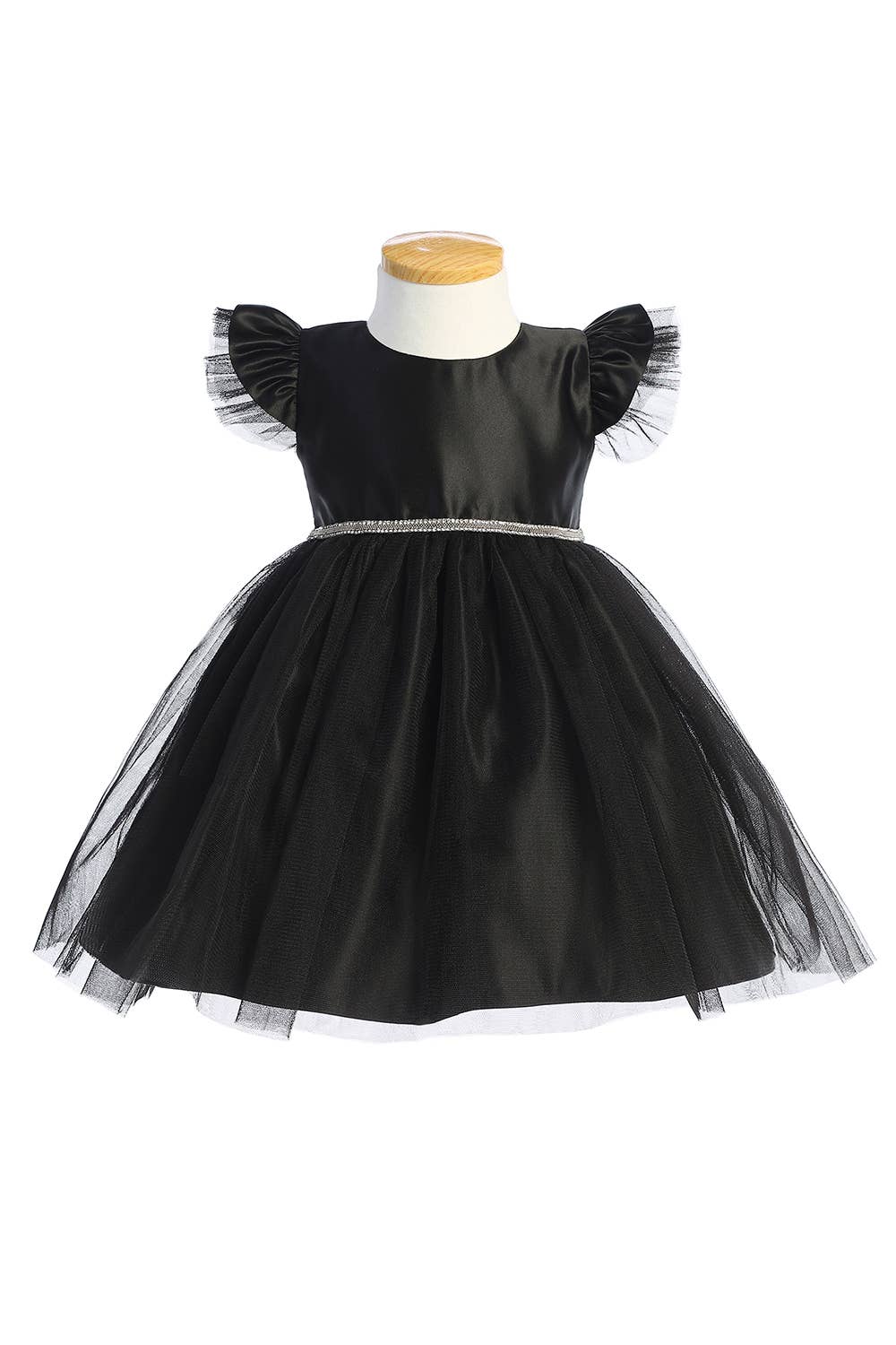 Baby girl dress with satin top and crystal tulle flutter sleeves. Shiny crystal tulle overlay skirt with satin lining. Delicate rhinestone waist trim detail. Satin back belt with zipper for closure. Tea length.