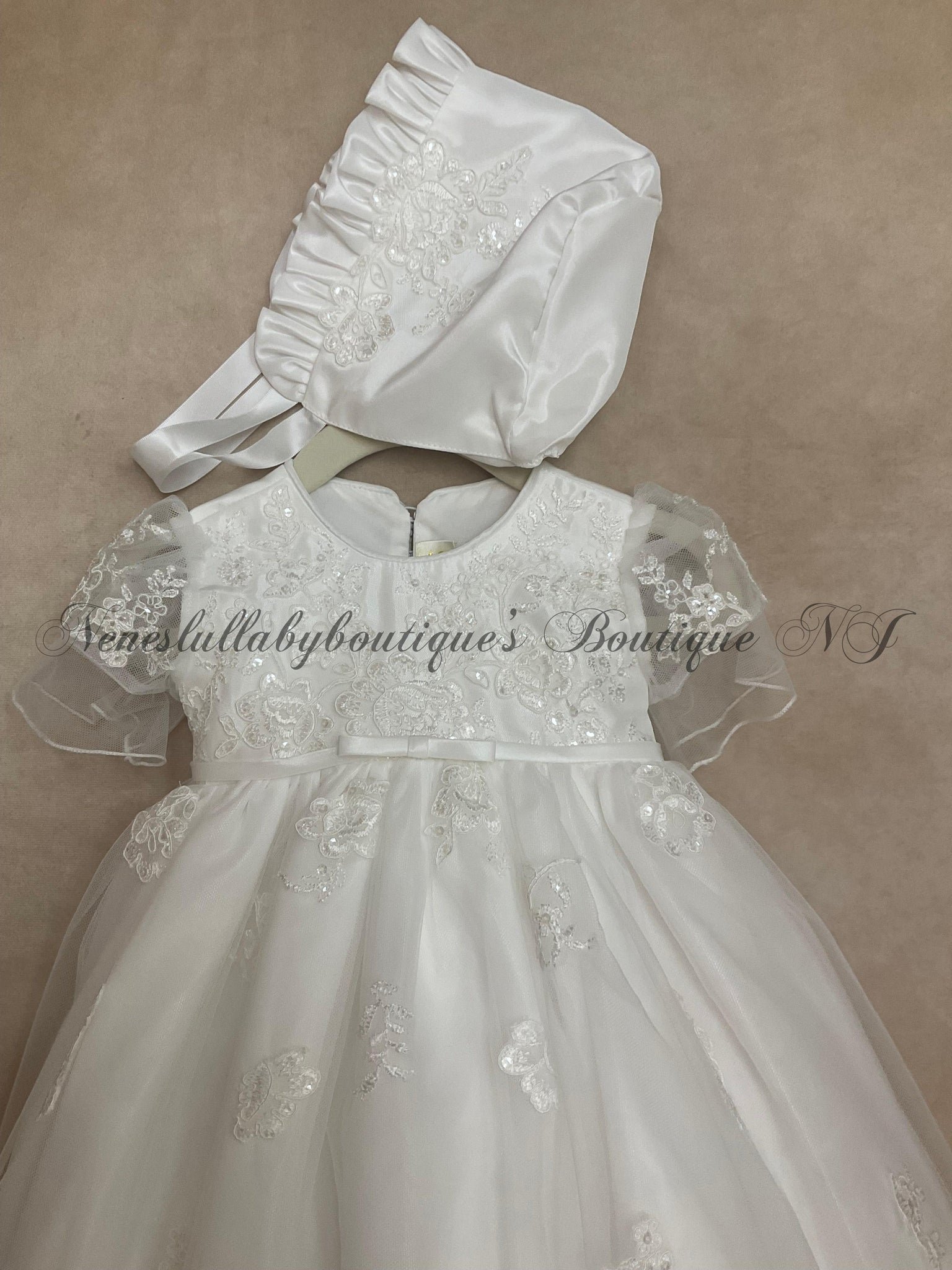 This beautiful egg shell taffeta & Lace Christening & Baptism gown with matching bonnet