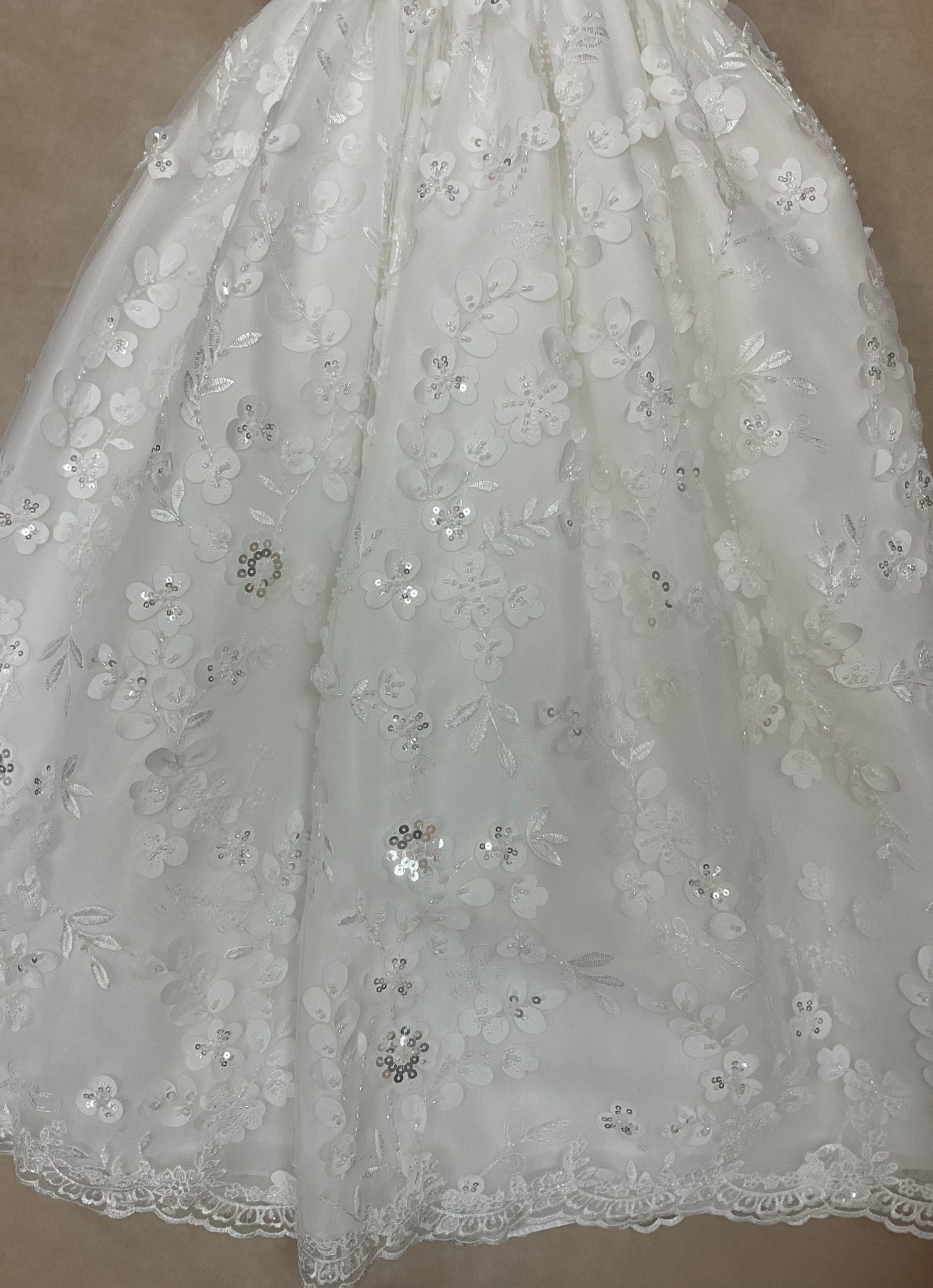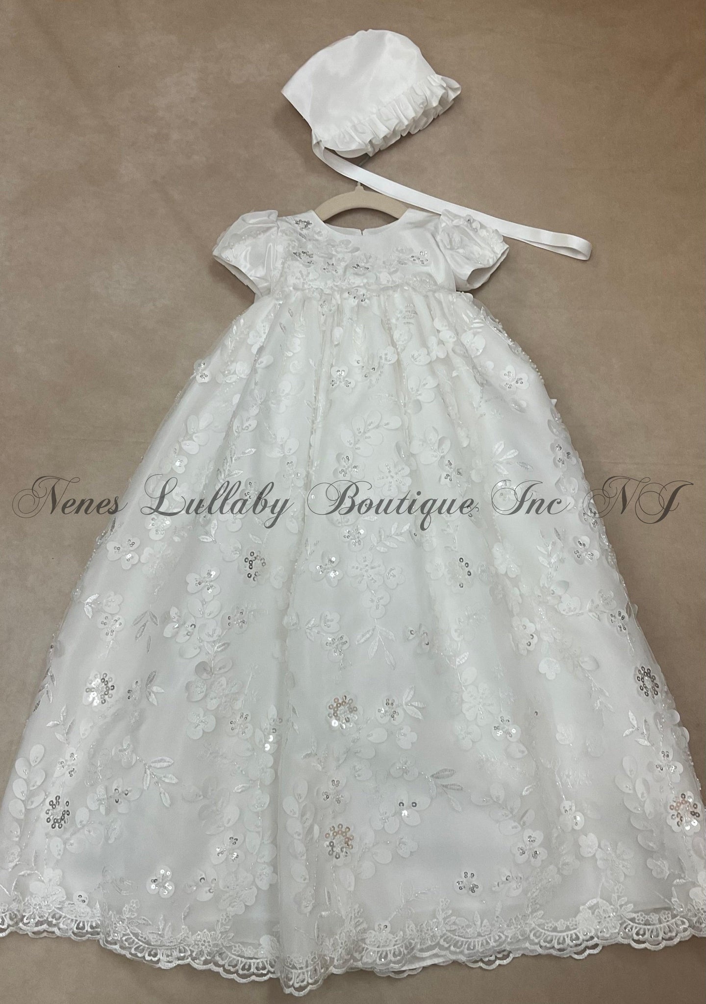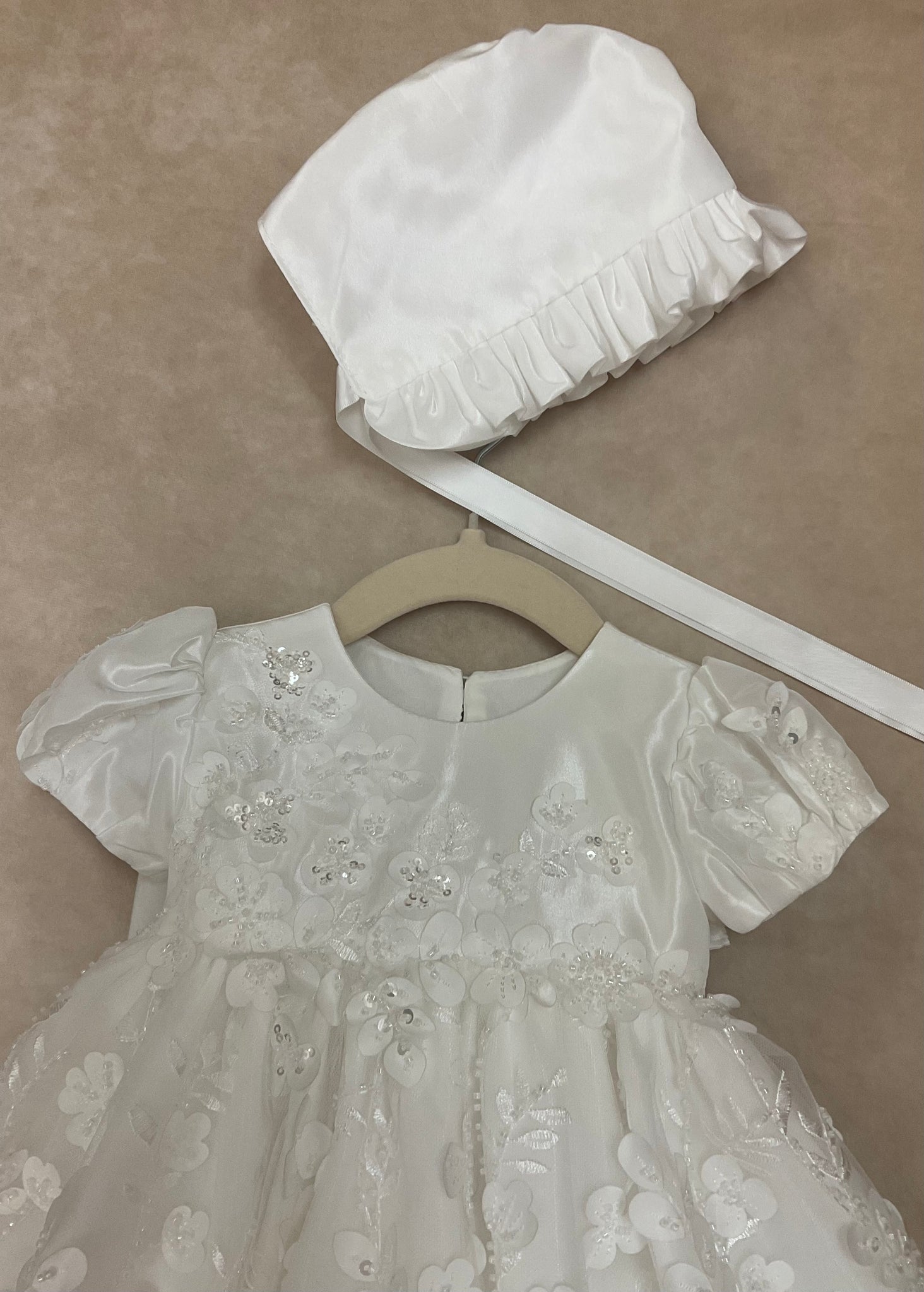 This beautiful egg shell taffeta & 3D Lace Christening & Baptism gown with matching bonnet