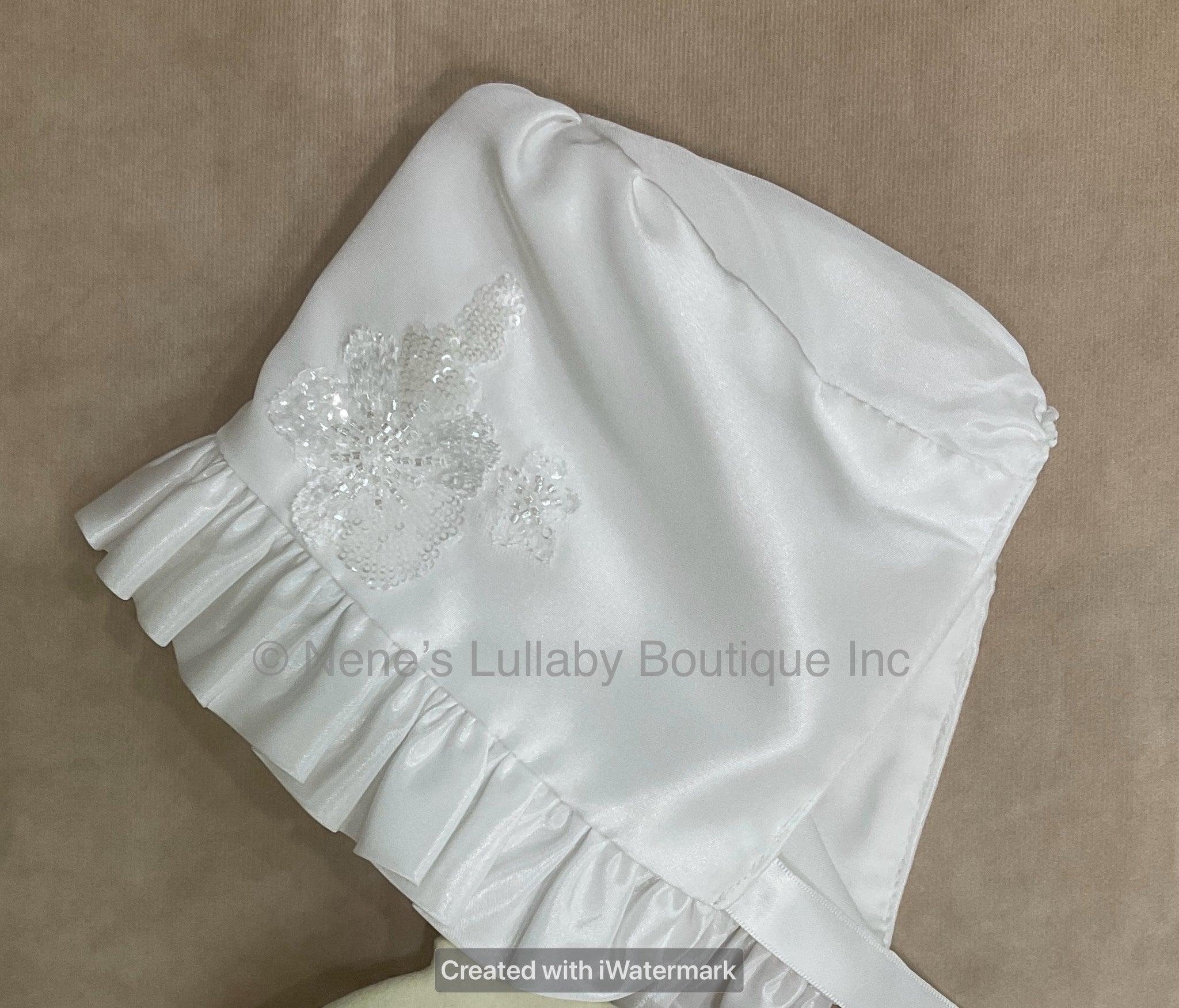 Crafted from delicate eggshell taffeta and intricate lace, this christening and baptism ensemble combines timeless elegance with refined craftsmanship. The gown features sophisticated detailing, while the coordinating bonnet completes a polished, heirloom-quality look perfect for your child's sacred milestone.