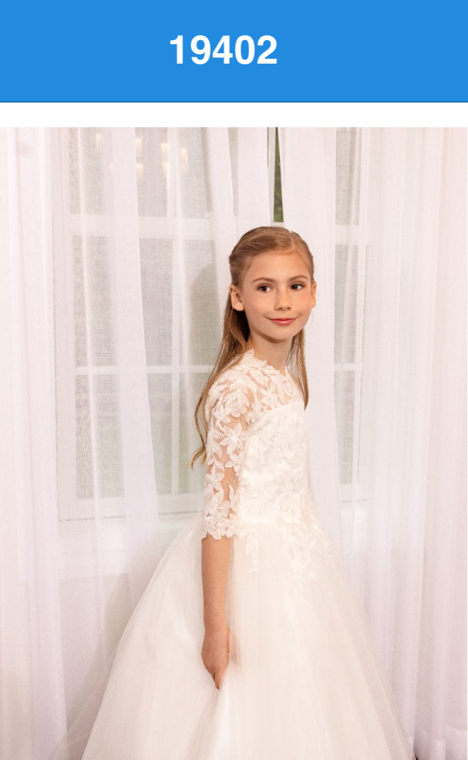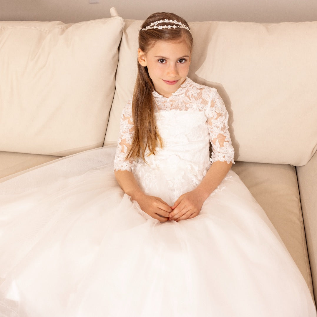 Celebrate this sacred milestone in timeless elegance. This communion dress features delicate 3/4 sleeves and an ethereal tulle skirt that captures the grace of the occasion. The stunning 3D floral accent at the waist adds a touch of sophistication, while the classic ivory hue ensures your child looks picture-perfect for this cherished day.