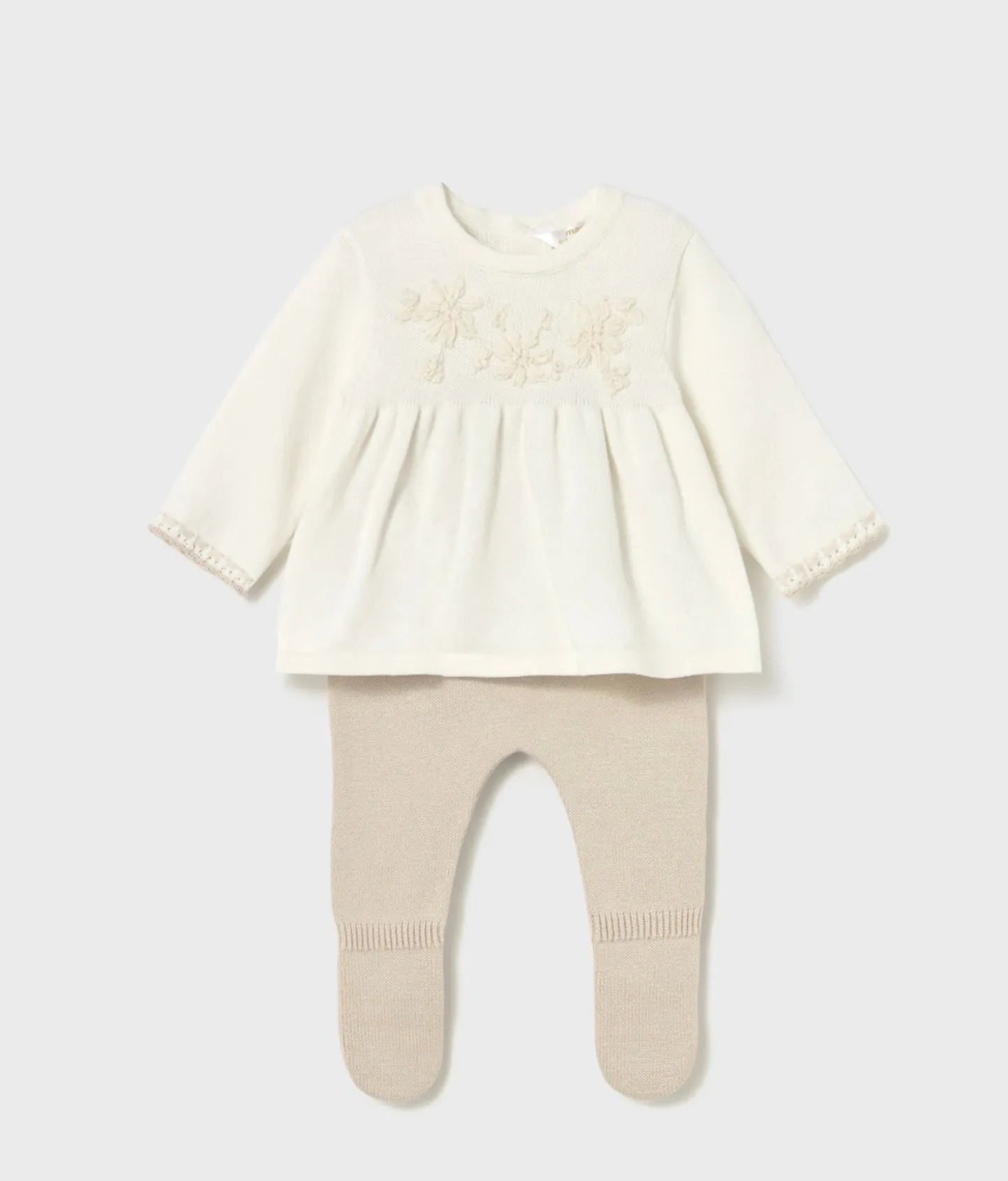 This adorable two-piece set of knit leg warmers for infant girls in a charming cream and coffee color features delicate embroidered flowers for a sweet, stylish touch.