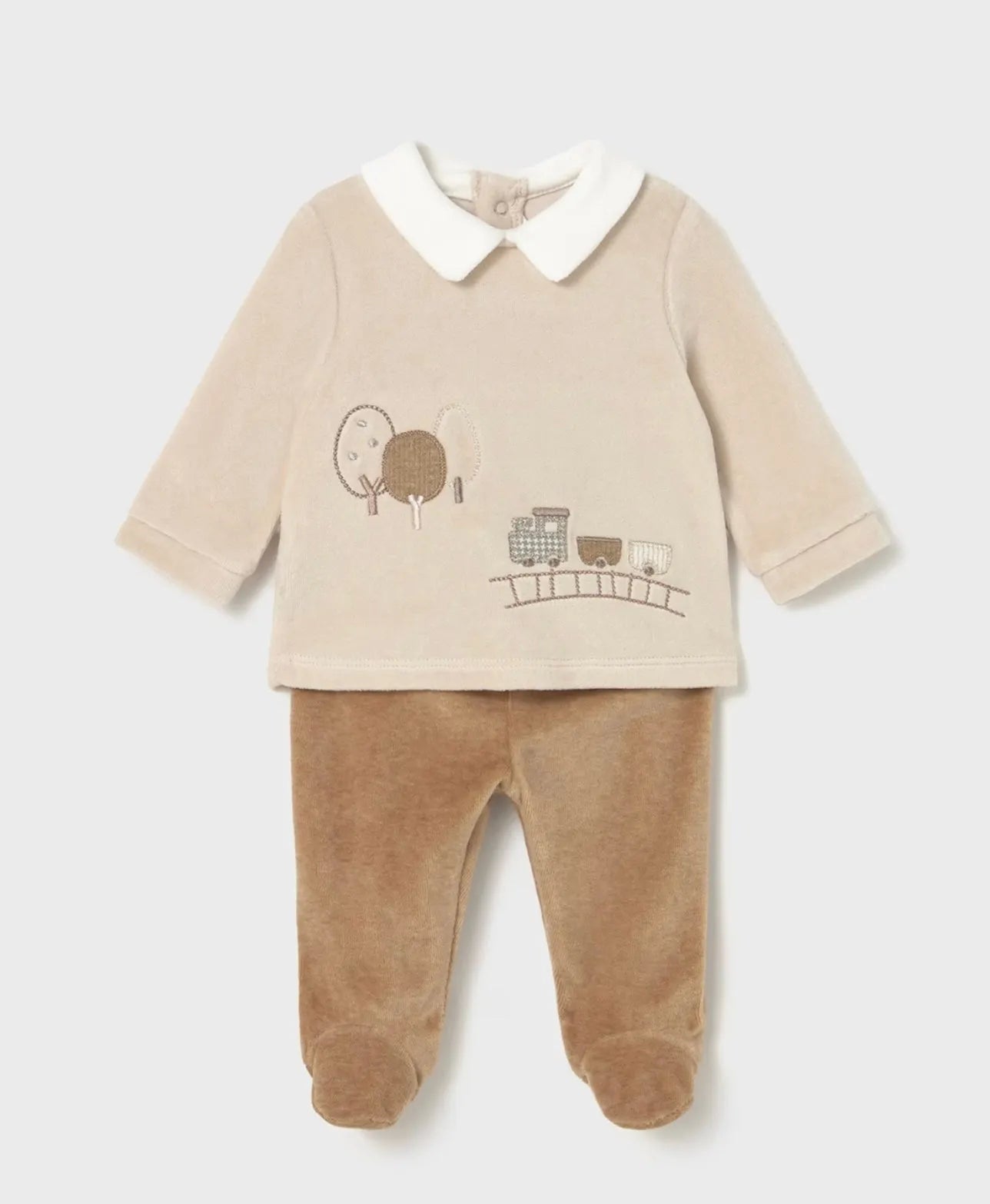 This cute two-piece velour outfit in warm brown and cream colors showcases a playful train design, adding a stylish flair perfect for your little boy.