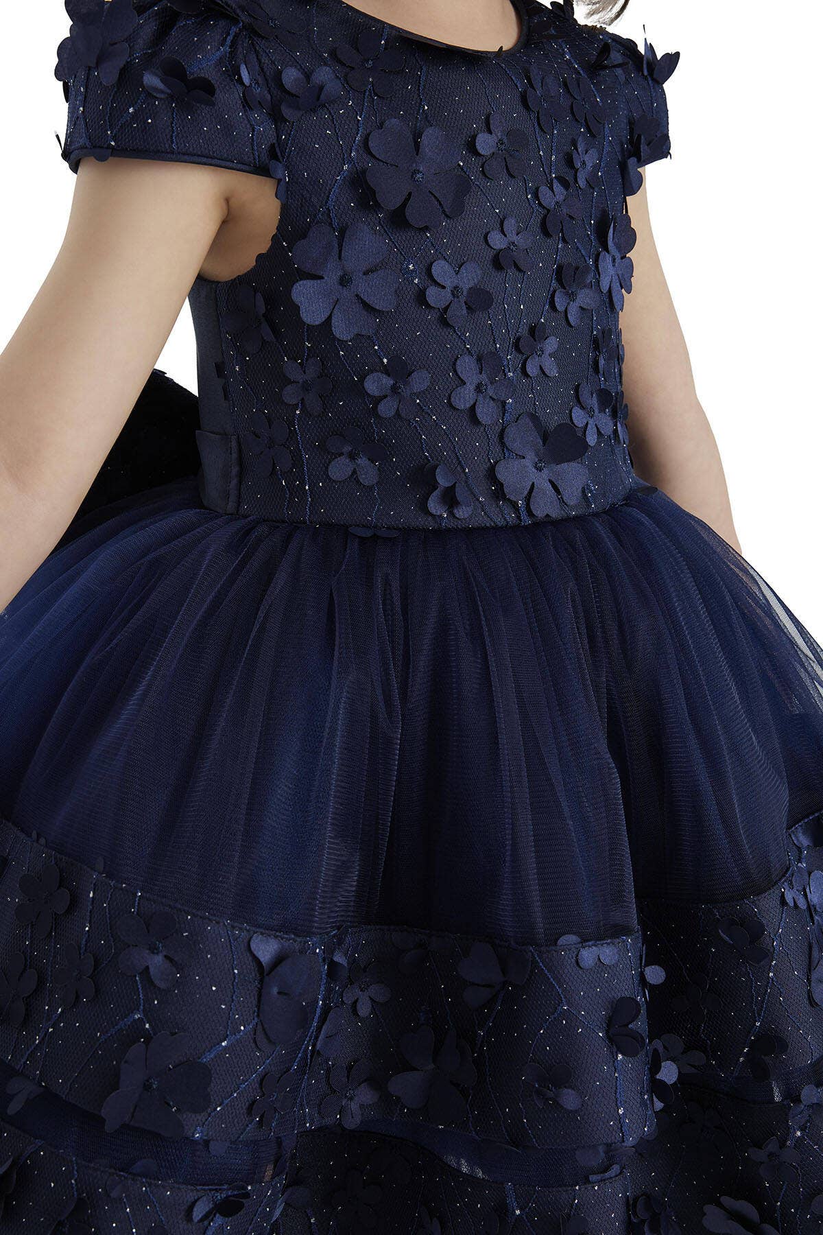 LINING FABRIC: %100 COTTON MAIN FABRIC: %100 POLYESTER The glimmering lace fabric of this dress with the cap sleeve makes it a sparkling design for a little girl. The dress is adorned with 3D flowers on the bodice and hem, giving it a grand and showy appearance. The layered tulle skirts create a voluminous shape with the help of inner layers of tulle. The dress also features a large floral bow at the back, which is sure to steal every child's heart. It is a comfortable and stylish dress with its soft cotton lining. The cute hair accessory is a special design by Pamina. It is a chic choice for a birthday dress. Navy Layered Skirted Girls Dress 6-24 MONTH Product Features: Tulle fabric, glittery lace fabric Crew neck Short sleeve With bow accessory With hair accessory Each set consists of 5 different ages There are sizes for 6 months, 12 months, 12 months, 18 months and 24 months.
