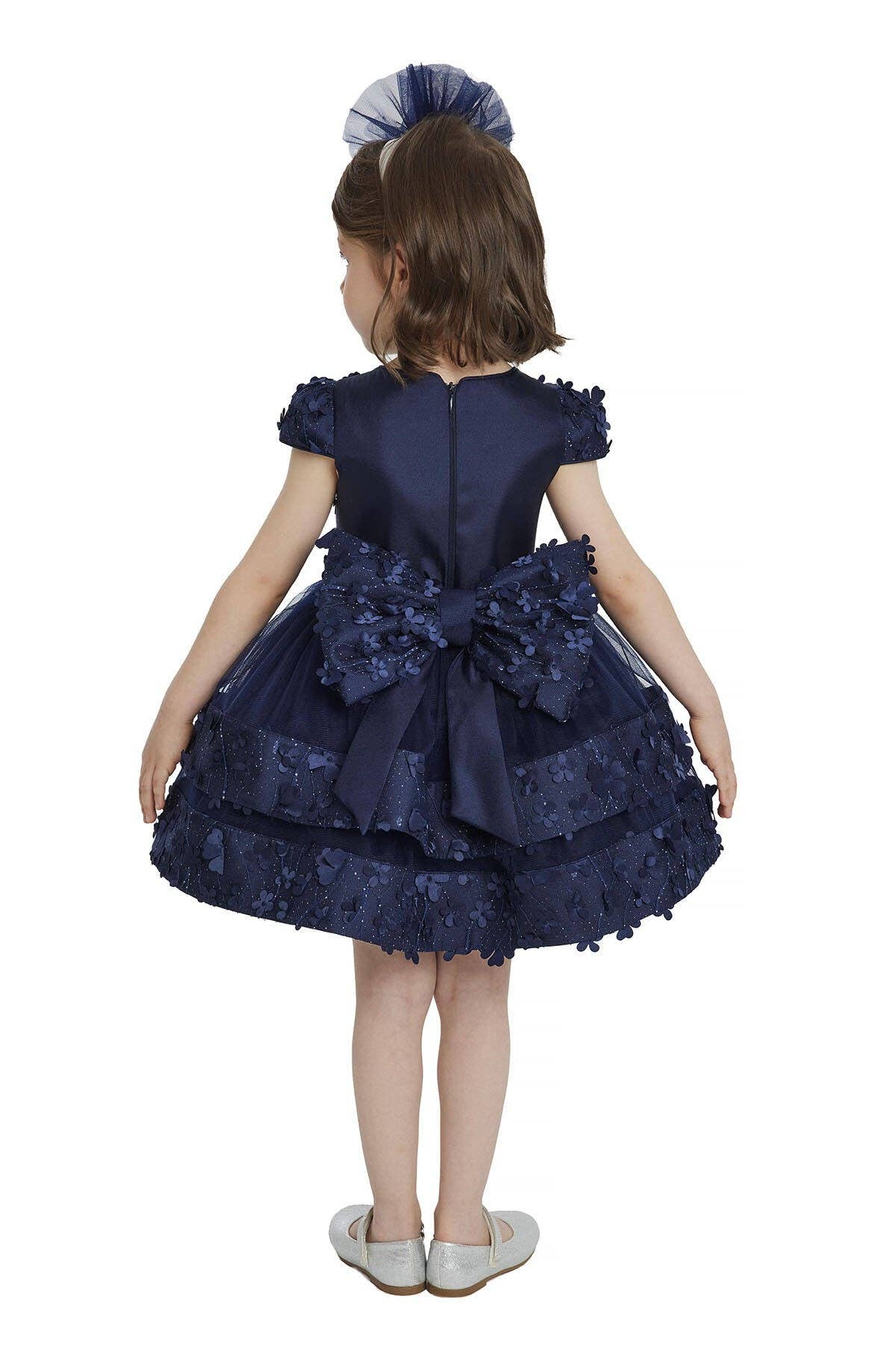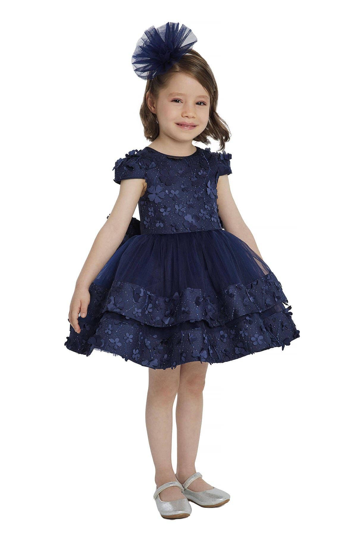 LINING FABRIC: %100 COTTON MAIN FABRIC: %100 POLYESTER The glimmering lace fabric of this dress with the cap sleeve makes it a sparkling design for a little girl. The dress is adorned with 3D flowers on the bodice and hem, giving it a grand and showy appearance. The layered tulle skirts create a voluminous shape with the help of inner layers of tulle. The dress also features a large floral bow at the back, which is sure to steal every child's heart. It is a comfortable and stylish dress with its soft cotton lining. The cute hair accessory is a special design by Pamina. It is a chic choice for a birthday dress. Navy Layered Skirted Girls Dress 6-24 MONTH Product Features: Tulle fabric, glittery lace fabric Crew neck Short sleeve With bow accessory With hair accessory Each set consists of 5 different ages There are sizes for 6 months, 12 months, 12 months, 18 months and 24 months.