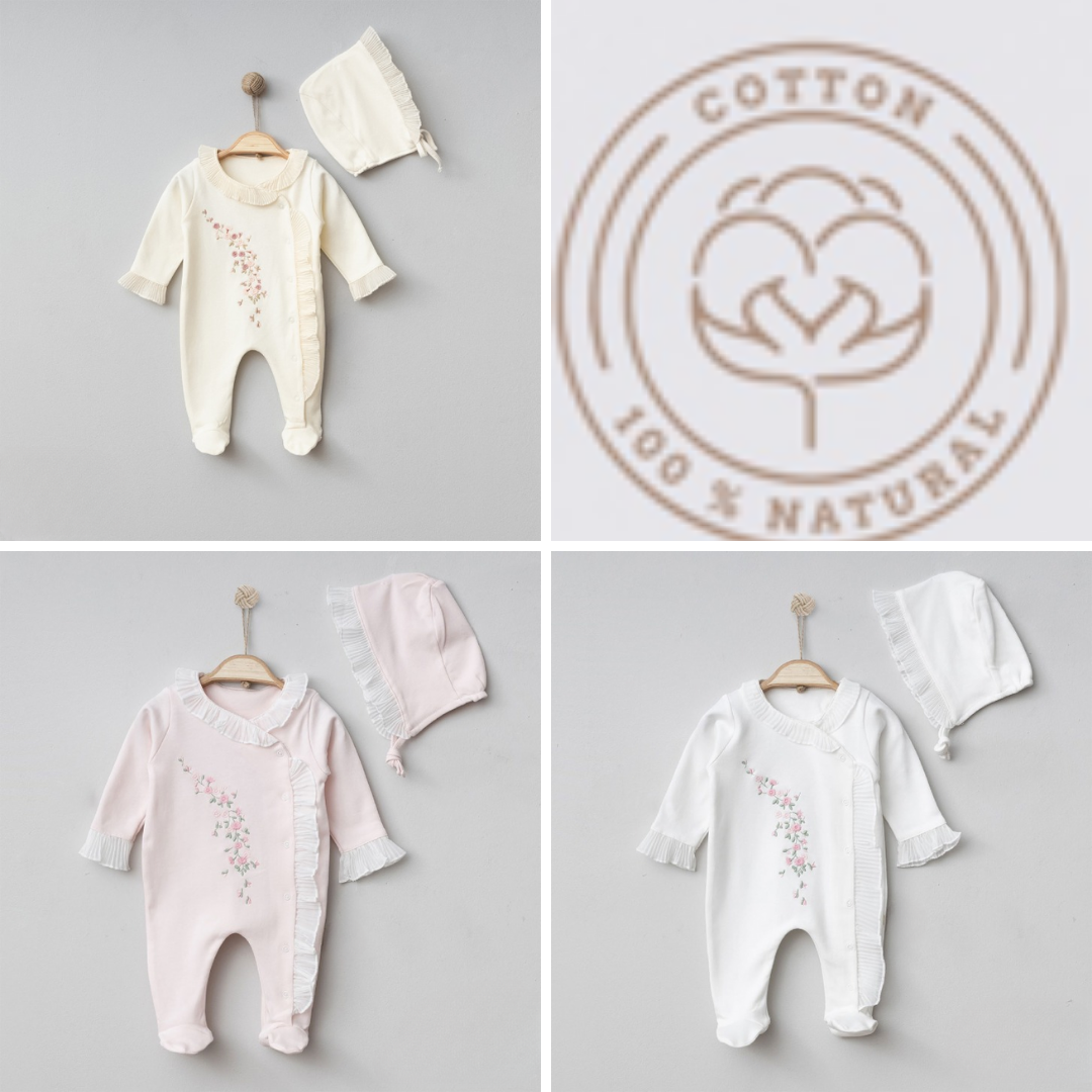 Elegant Special Collar Girl's Newborn Onesie & Bonnet Set This beautiful set comes with matching bonnet. The sets are in powder pink, cream and white colours Each colour is a Pack of three sizes: 0-3M, 3-6M, 6-9M Powder Pink, Cream and White colours This outfit is the perfect gift for the newborn with its specially sewn collar. *100% super soft best quality cotton, *Perfect design, *Easy to use snap fasteners on the onesie, *Very elegant lace pleated onesie and bonnet edges, *Onesie also embroidered with very elegant small flowers figures. Gentle wash with gentle detergents. Do not bleach, do not tumble dry. Hang to dry. Family Heirloom Baby Gifts.