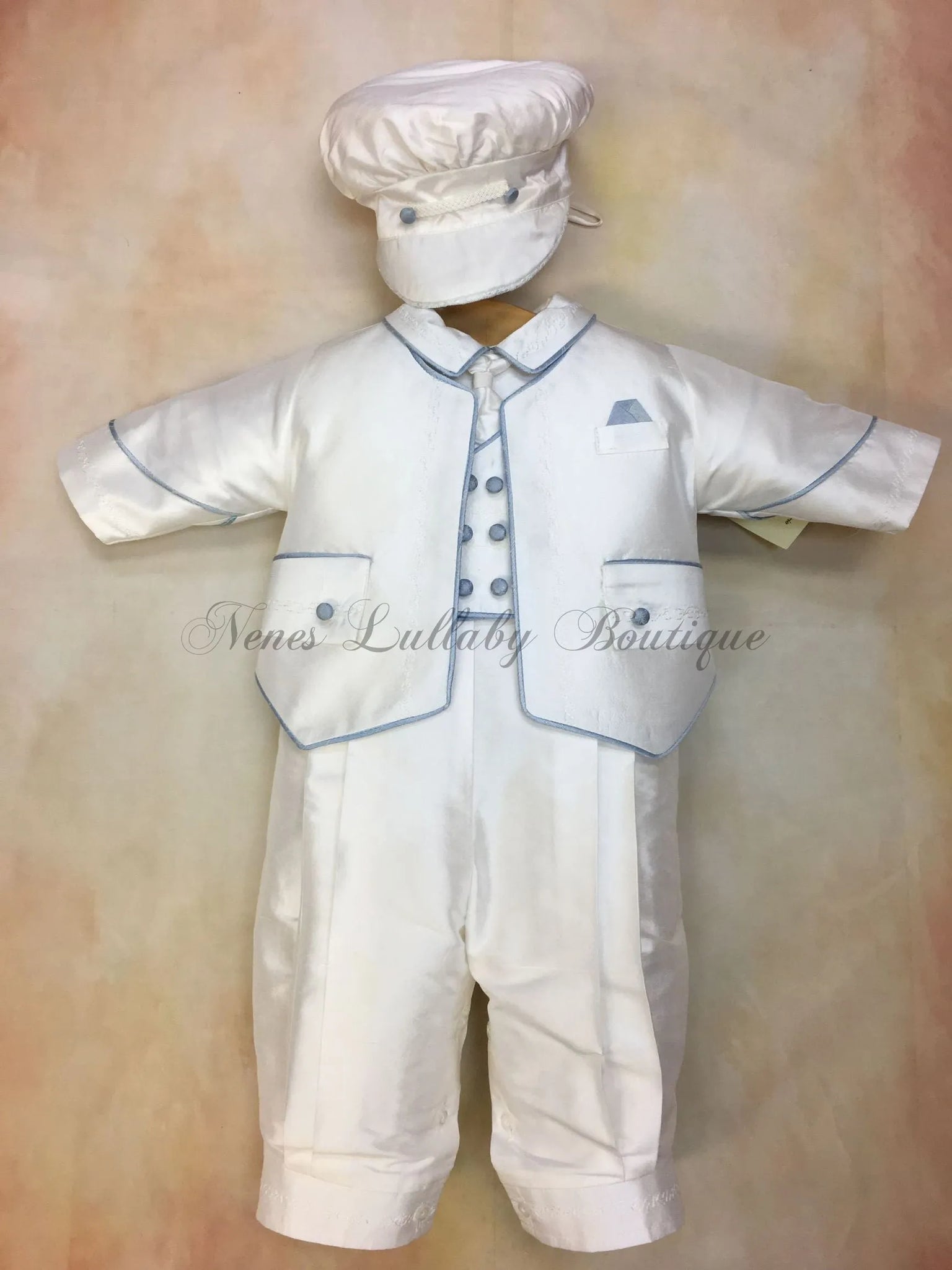 Crafted with 100% white silk, the Blue Nunzio Christening suit by Piccolo Bacio offers a sophisticated touch to your little one's special day. The blue piping on the jacket, vest, and matching newsboy cap adds a charming contrast. Perfect for a timeless and elegant baptism or christening ceremony.