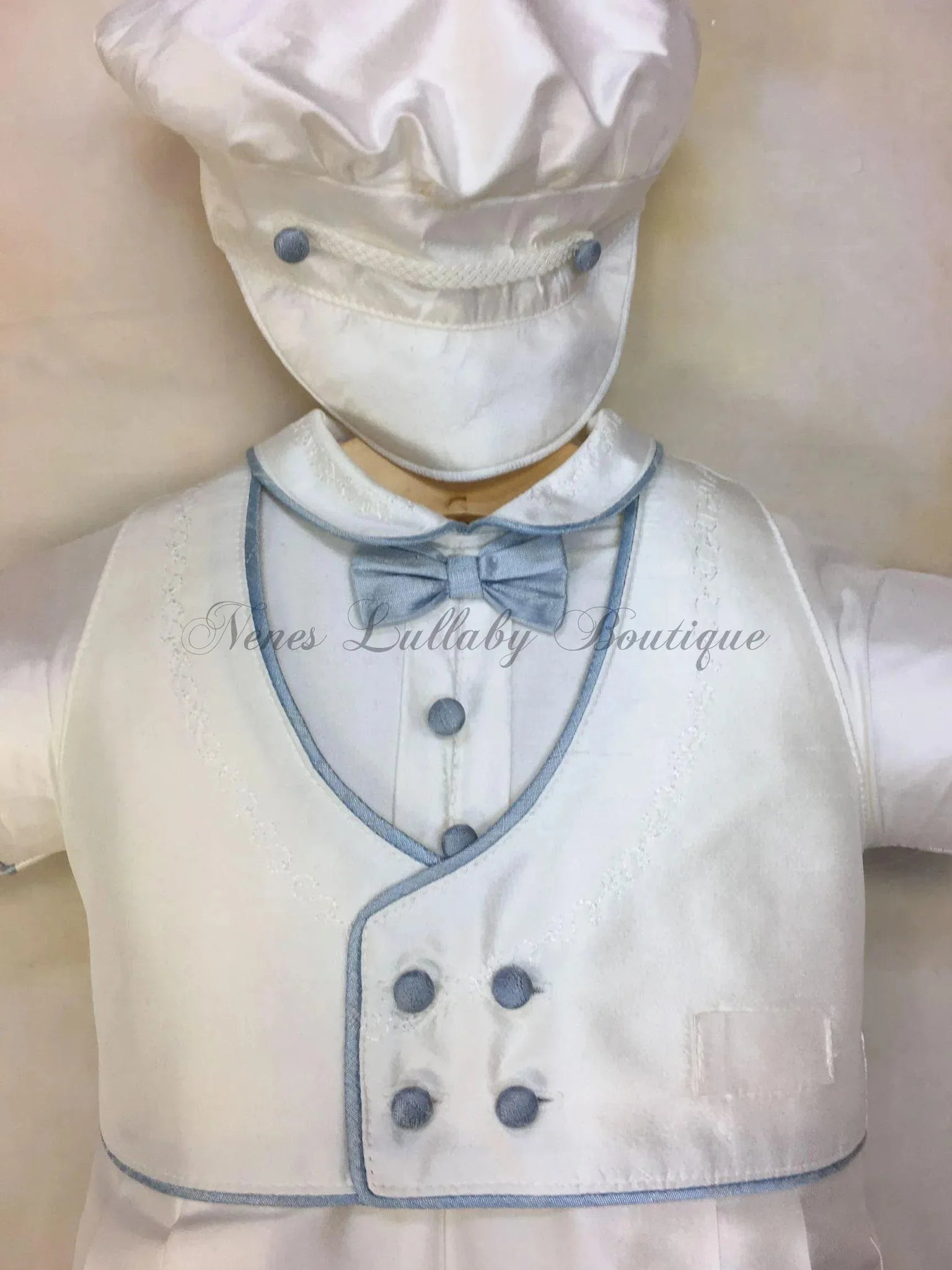 Blue Willie by Piccolo Bacio Christening Couture comes in white silk adorned with blue piping