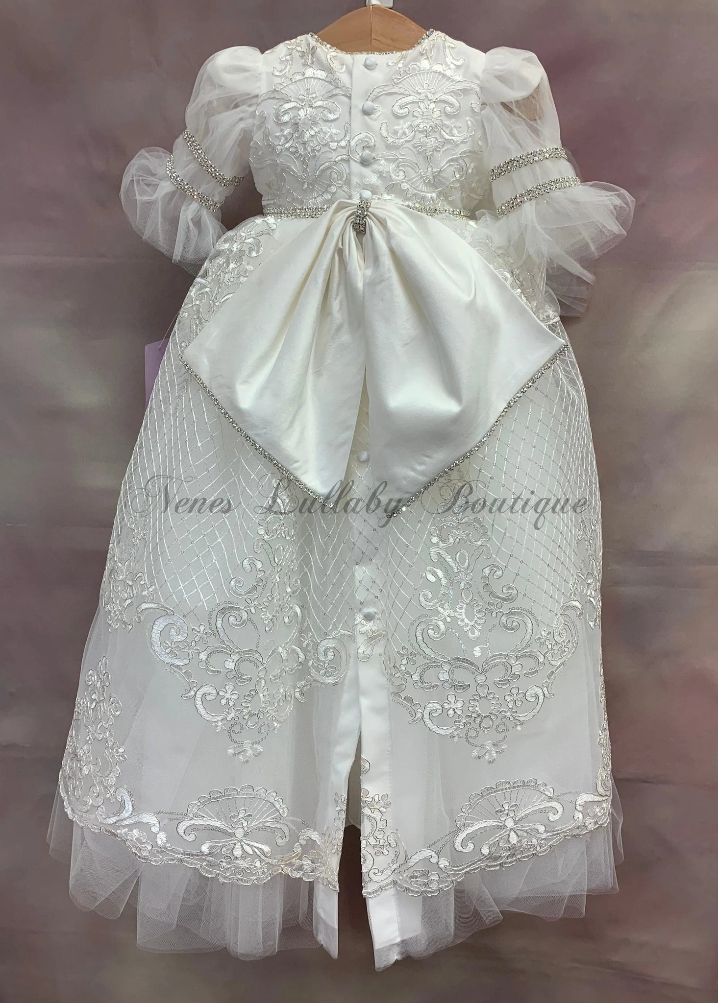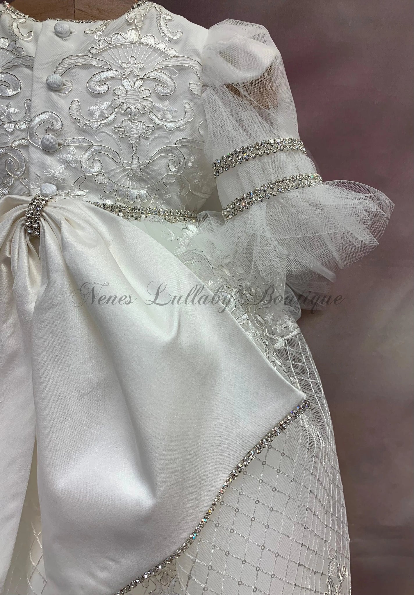This Piccolo Bacio Couture christening gown features a beautiful white metallic re-embroidered lace design with a complementary bonnet.