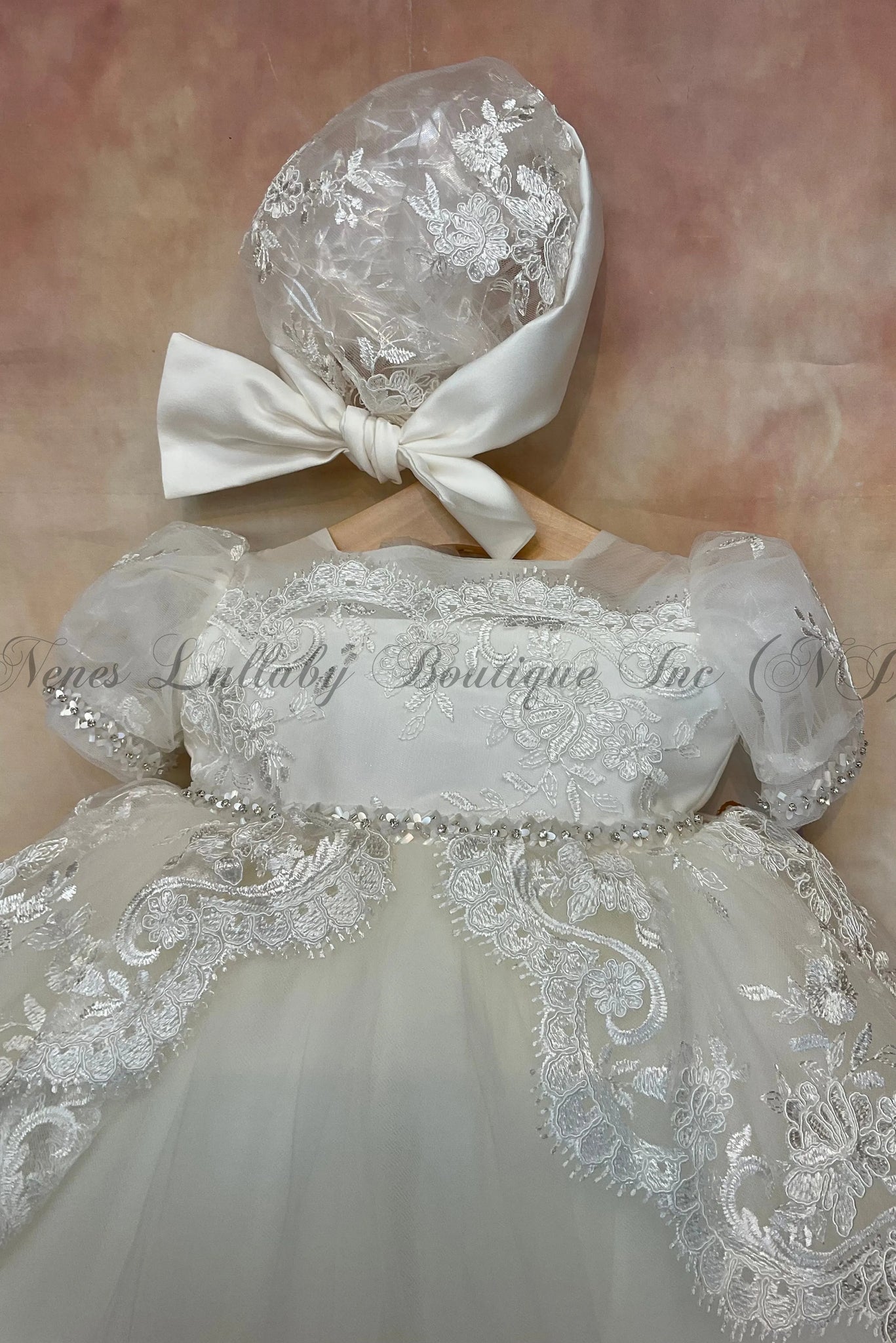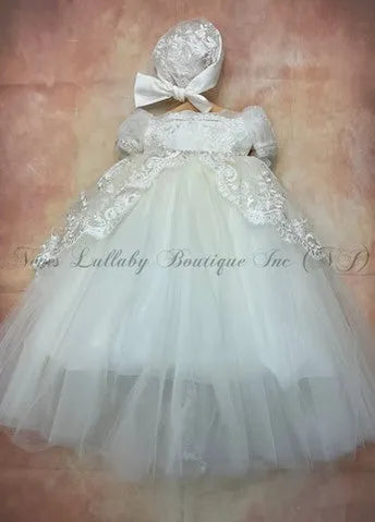This Annita Christening / Baptism Gown by Piccolo Bacio Christening Couture is a timeless and luxurious piece, perfect for your special day. Made with high-quality Satin, Lace, and Tulle, and featuring a classic eggshell hue and matching cap, it exudes elegance and sophistication. A must-have for any heirloom collection. Made in the USA