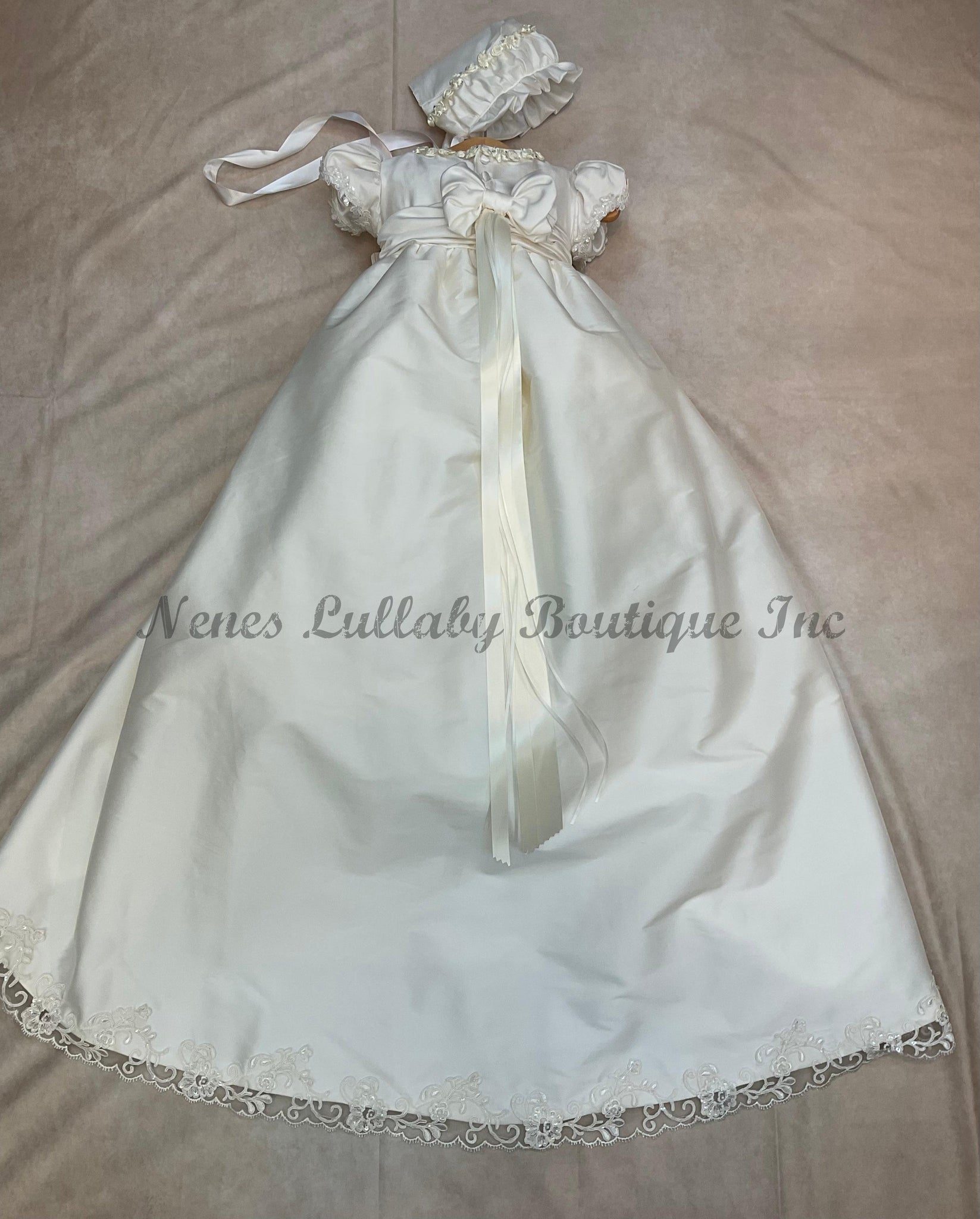 The Colleen 2024 Christening Gown is a timeless and luxurious heirloom piece, exquisitely crafted from 100% white silk for a smooth and durable design. This elegant gown features a beautiful high-low silhouette, with a length of 42 inches. Each gown is made to order, with a three-week lead time.