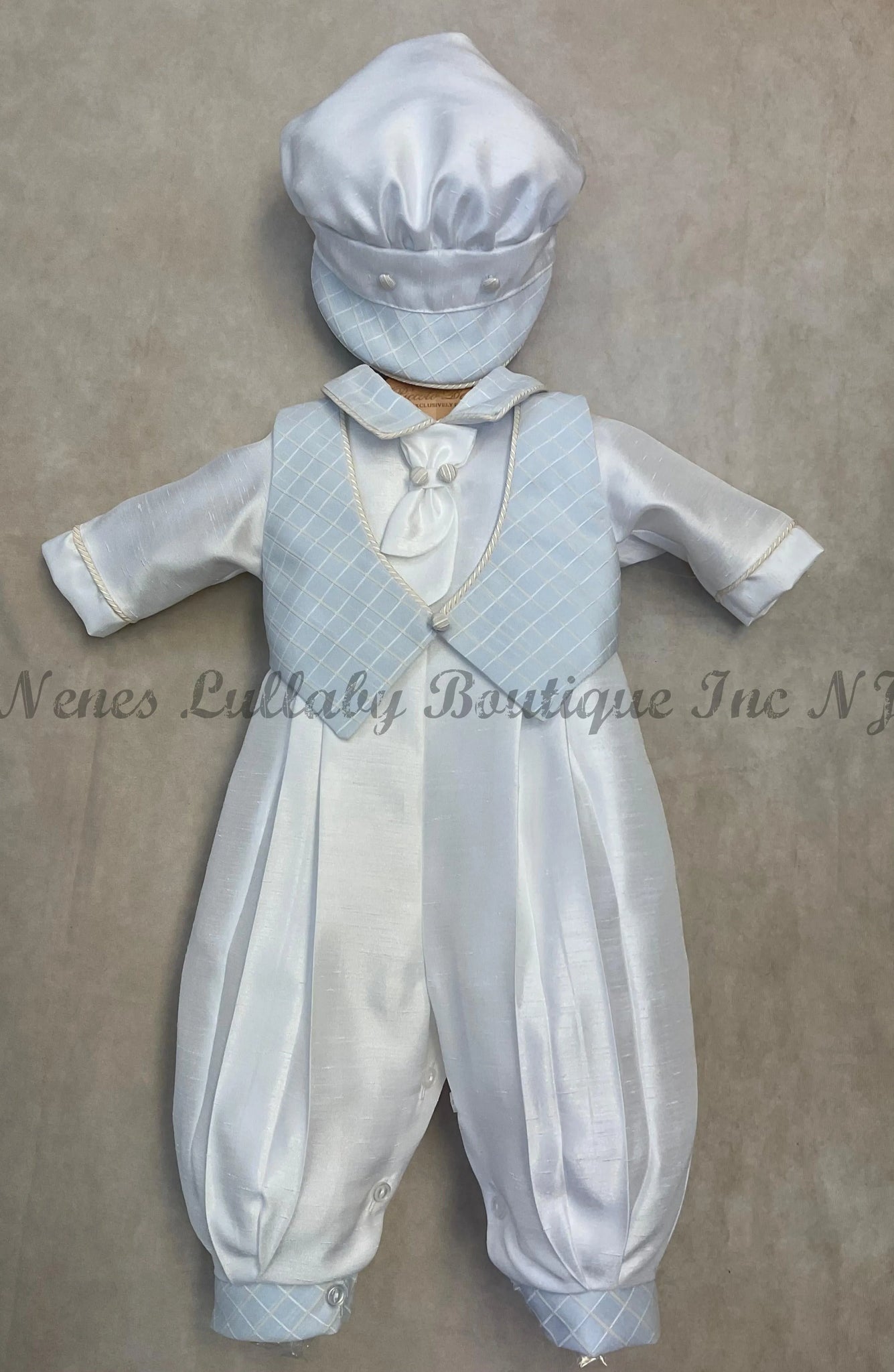 This Felix Shantung Christening/Baptism outfit by Piccolo Bacio offers a sophisticated look for your little one. Made with boys optic white shantung fabric and a blue waffle vest, long sleeve and long pants, and a matching tie and new boy rider cap, this outfit is sure to make a statement at any special occasion. Elevate your child's style with this high-quality, stylish ensemble.