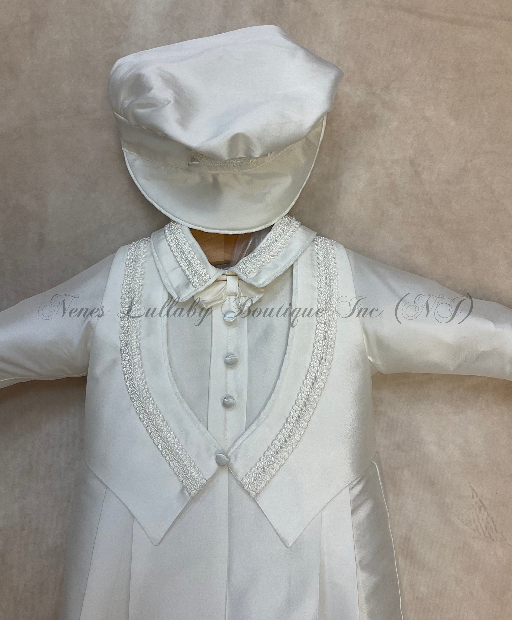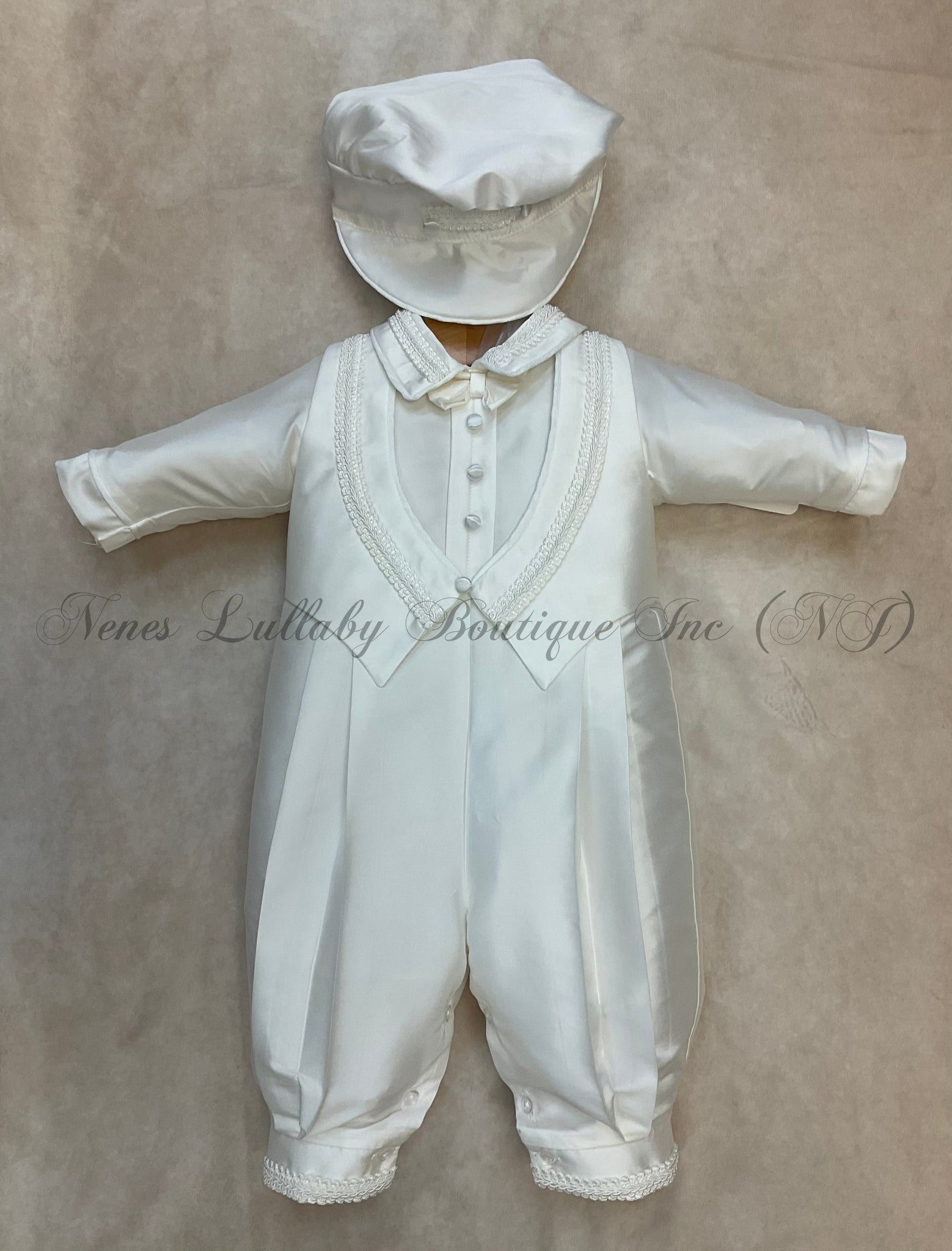 This all white silk Christening Romper, with its long sleeves and long pant design, features intricate trim detailing on the vest and leg pant cuff for a truly handsome look. Perfect for your baby's special Christening or Baptism day, this outfit exudes elegance with a formal and classic touch.