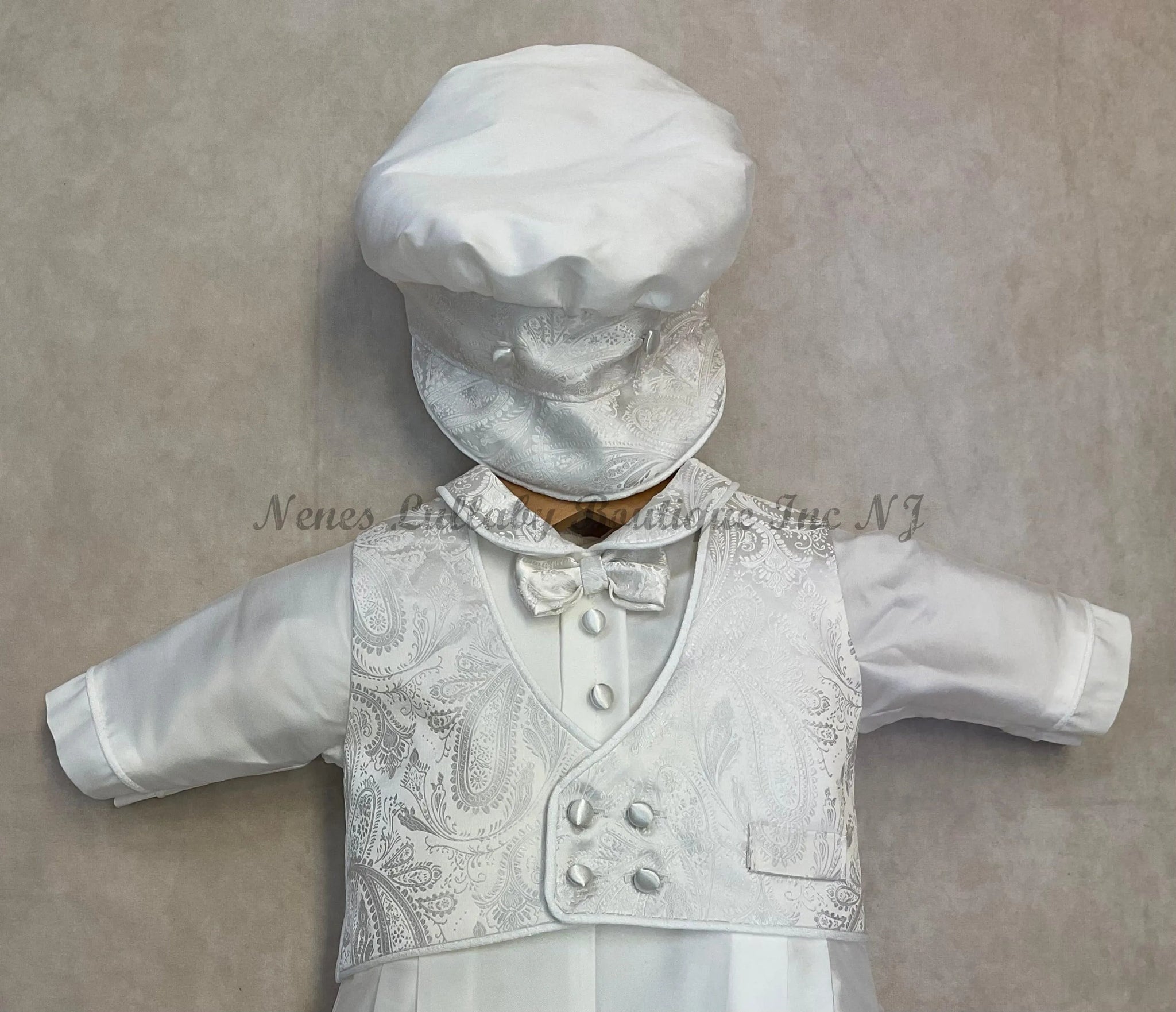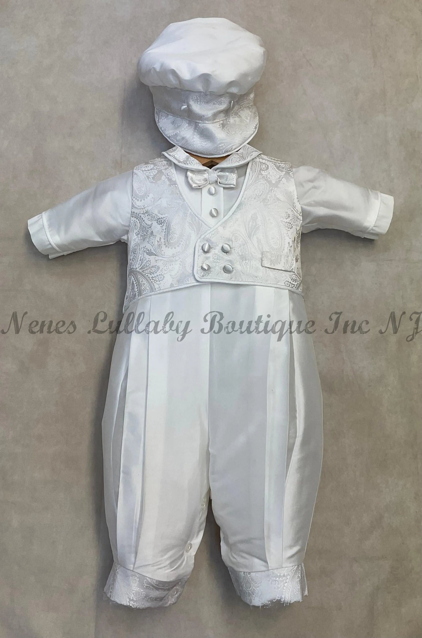 Complete your little one's christening look with this handsome white silk romper by Piccolo Bacio. The brocade vest add a touch of sophistication to the long sleeve and pant design. Paired with the matching rider cap, this couture suit is perfect for baptism ceremonies.
