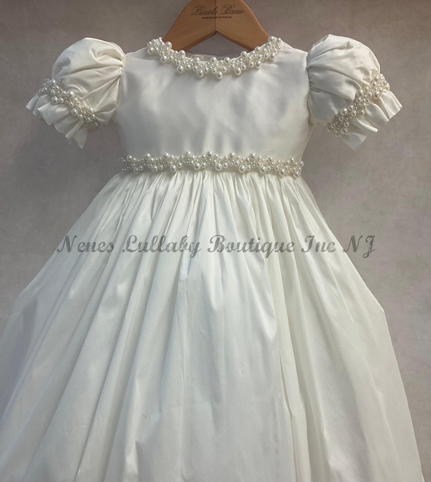 The Giovanna Christening Gown by Piccolo Bacio features luxurious white silk adorned with delicate pearls along the neckline, sleeves, and hem. This elegant ensemble is completed with a coordinating bonnet, making it the perfect choice for a memorable baptism.