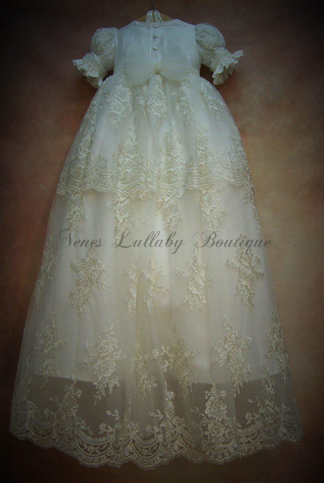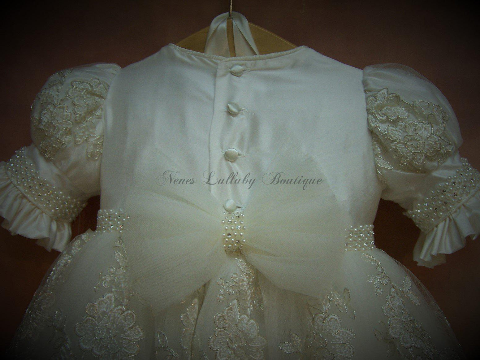 Crafted with care, the Martin Heirloom Christening Gown by Piccolo Bacio is a timeless piece adorned with delicate lace and accented with sparkling rhinestones. It also comes with a matching bonnet, completing the elegant look.