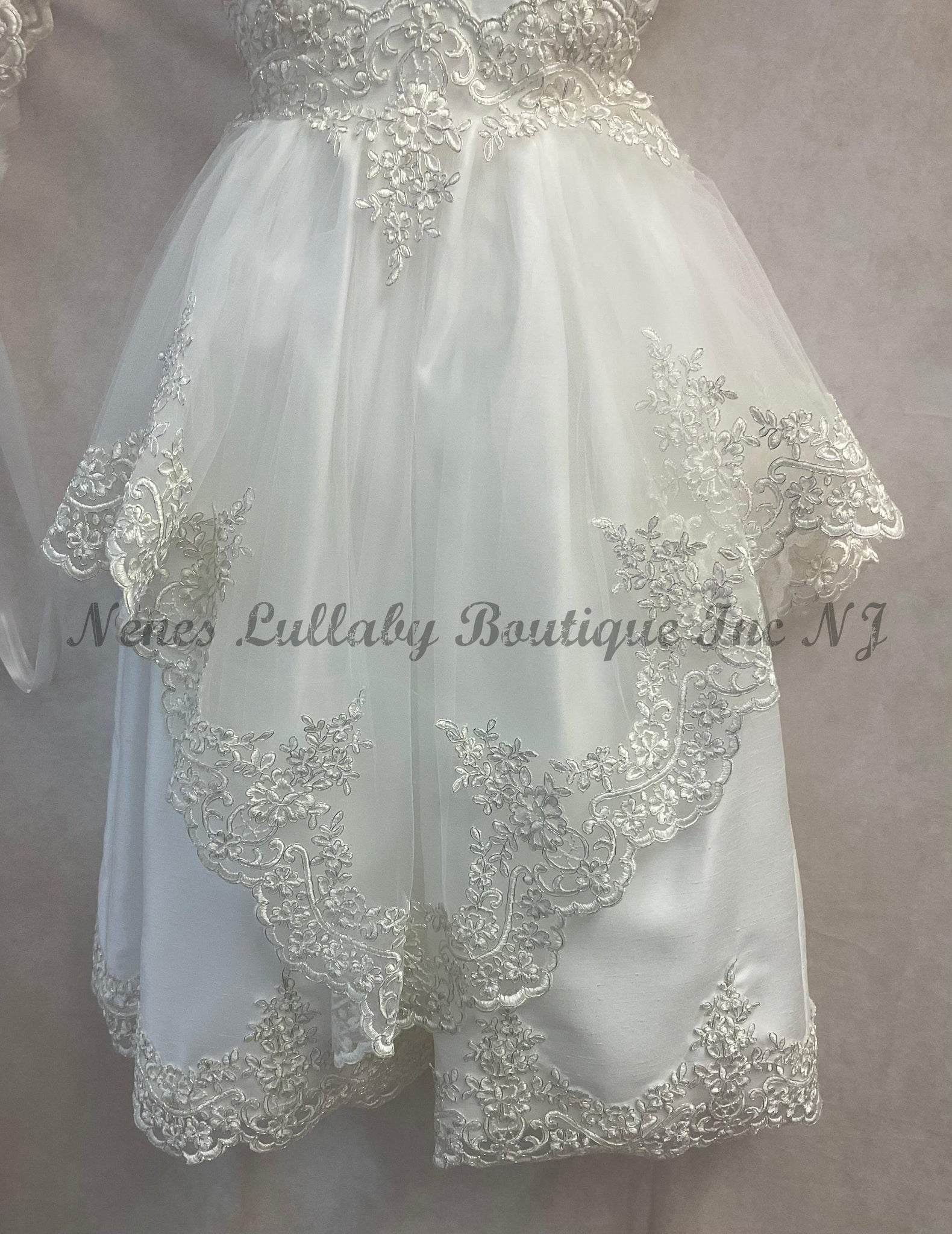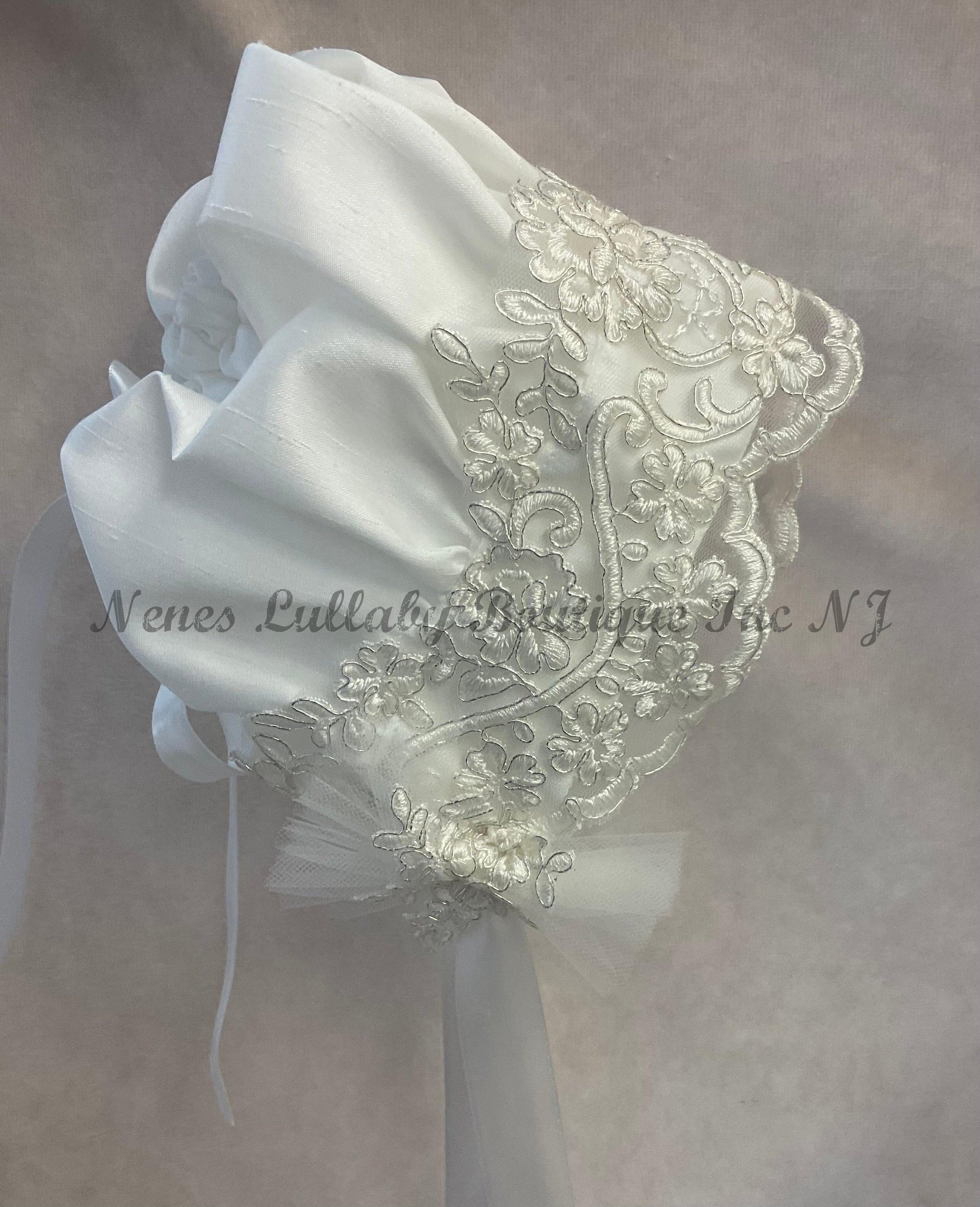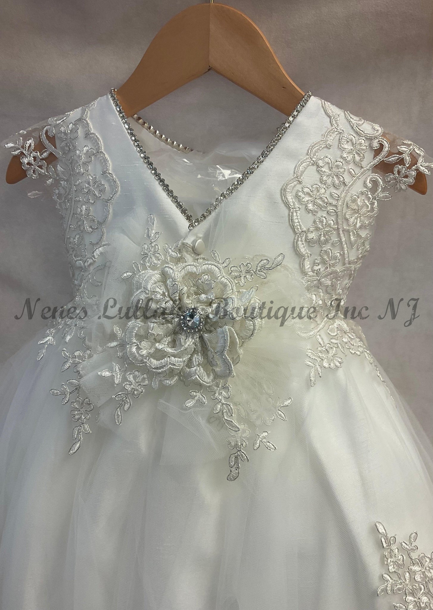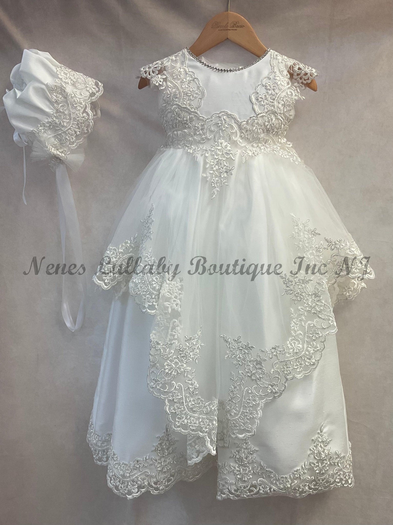 The Maxine Christening Gown by Piccolo Bacio features delicate ivory poly fabric and tulle, enhanced with elegant metallic lace detailing. This exquisite set includes a coordinating bonnet, perfect for your baby's special day. Discover this beautiful ensemble at www.neneslullabyboutique.com.