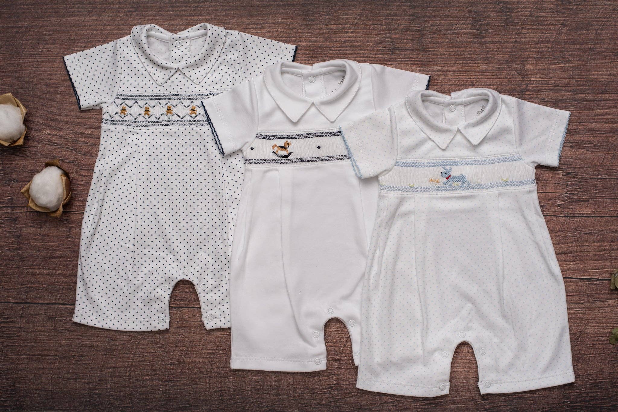 Our exquisite Peruvian Pima Cotton Romper with Handmade Smocking is a must-have for your baby and toddler's wardrobe. The combination of its soft and durable fabric makes it suitable for any event, be it playtime with friends or family gatherings. Its timeless charm and cozy comfort make it a versatile piece that can be worn effortlessly throughout the year. For a chic and snug look during the cooler months, simply pair it with knee-high socks, leggings, or tights. Your little one will look and feel great in this luxurious garment. This white and navy dots romper features a shirt-style collar and a handcrafted smocking, detailing cute bears and navy accents.