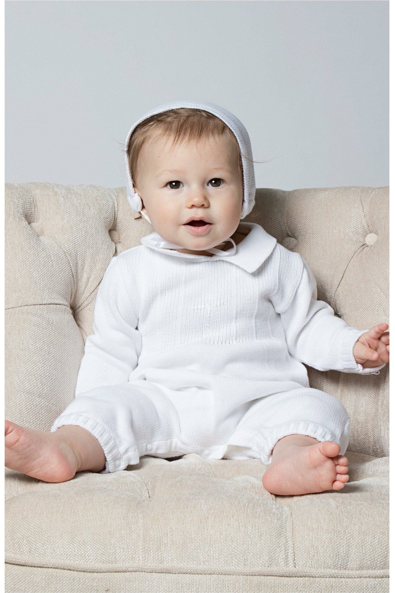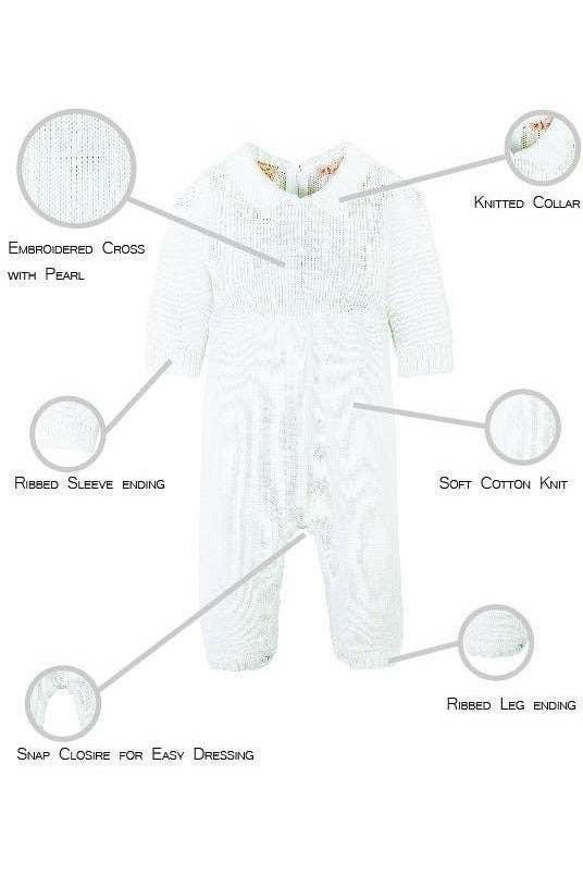 Our exclusive Christening Collection will be treasured for generations. This stunning collared one-piece in soft white, features a satin trim top with a knit cross adorned with a pearl in the center. Zip back and snaps underneath to assist with dressing. Perfect for before and after Christening. 100% Cotton. Machine Washable. * 100% Cotton * Machine Washable * Handmade * Traditional Wear * Christening/Baptism/Blessing