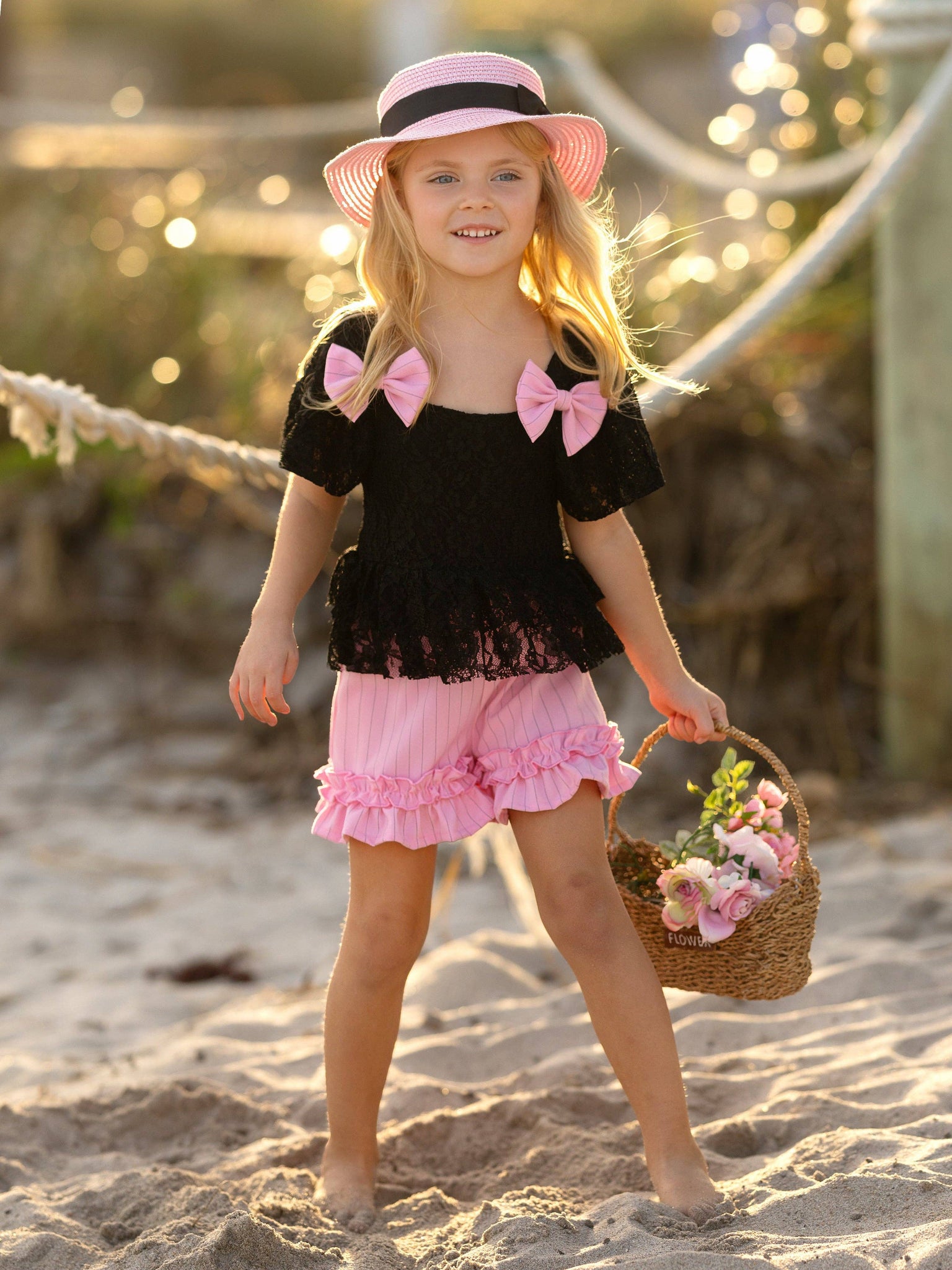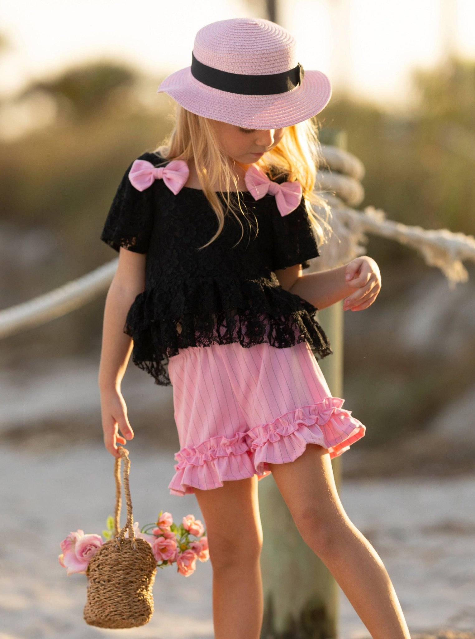 * Imagine picnic days and perfect sunsets while she's looking so gorgeous in our lace top and ruffle short set. Your little fashionista deserves a spring wardrobe that will have her looking like her best self! * Versatile pieces for endless style options. So easy to mix and match with her other faves! * Lightweight, soft fabric blend doesn't weigh her down on warm days. No itching, no sticky feels. * Perfect for spring vacations, casual outings, photoshoots and warm-weather fashion fun * Black lace top with pink bow accents and ruffle hem detail and pink shorts with ruffle hem and elastic waist * Available in sizes 2T-10Y for toddlers and little girls