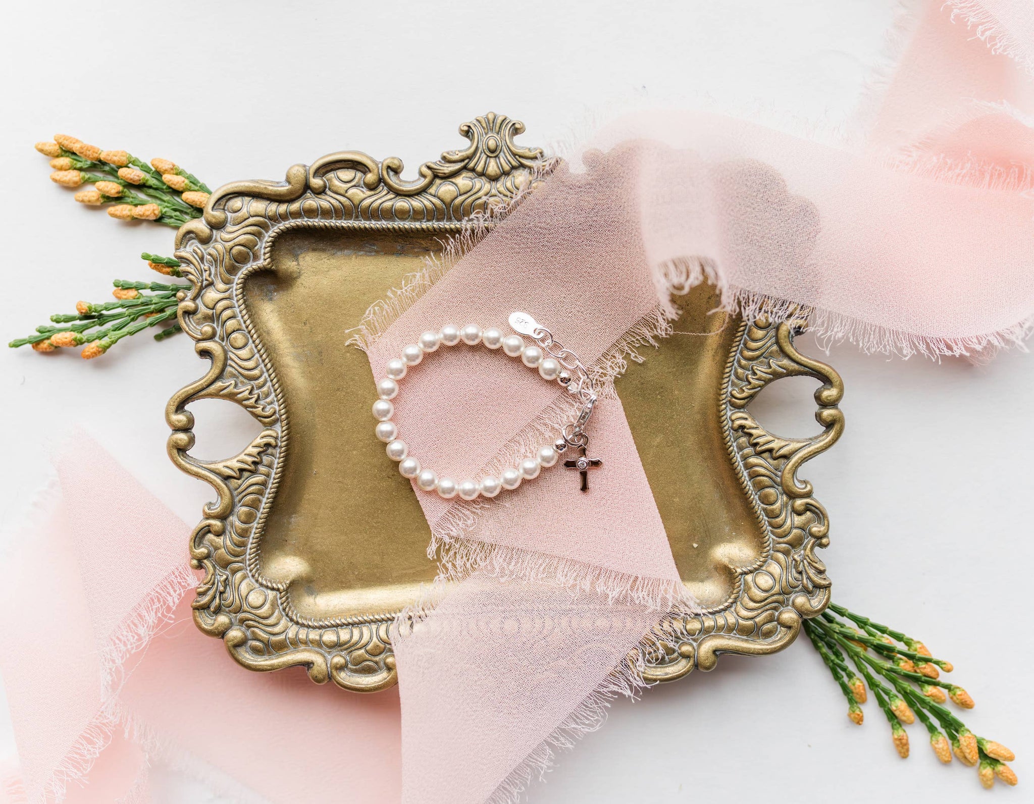 From our "Blessed Baby" Collection, this precious baptism, christening, or dedication bracelet is designed with .925 sterling silver and high-end Austrian simulated pearls and accented with a sweet dainty sterling silver cross charm (0-12 months adjustable). Each bracelet has an extension chain, as the child grows just move to the next link for a perfect fit. Celebrate these cherished moments with this keepsake she will treasure forever! Bracelet measures 4 - 4.5 inches and comes packaged with special inspirational poem and gift box.