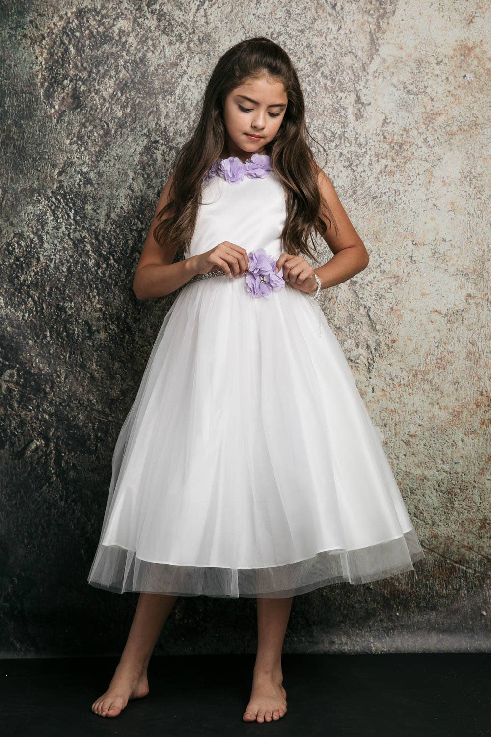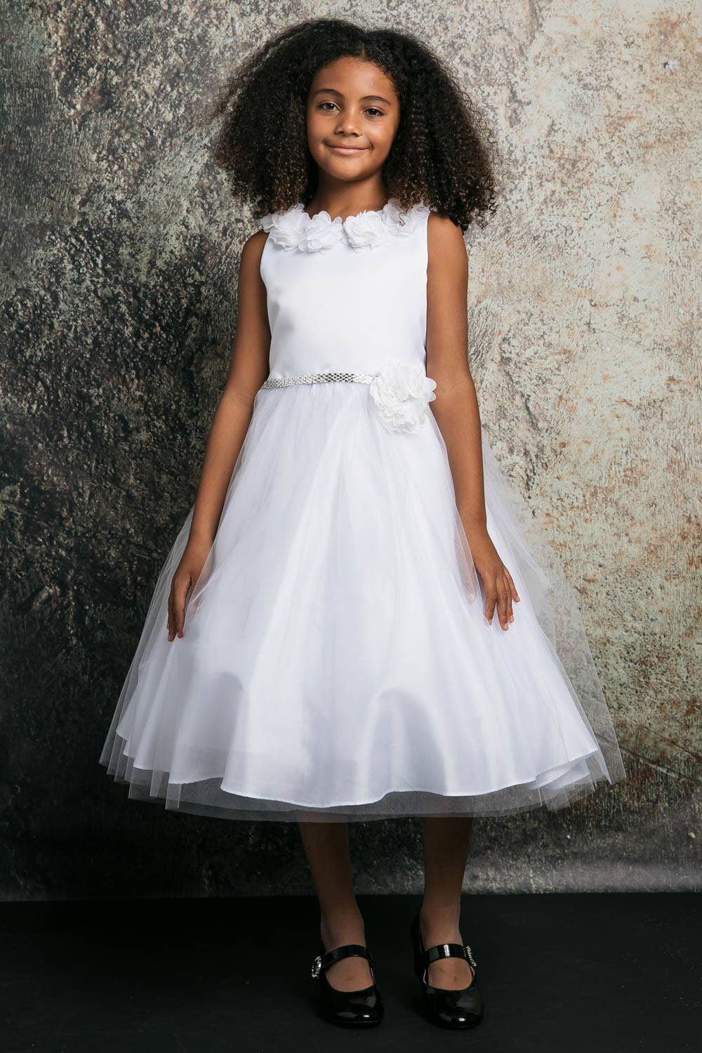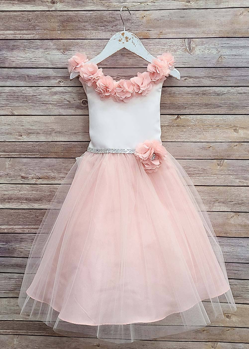 3D flowers Satin and tulle dress comes in one and two tone. Tea-length dress. Fully line, hidden back zipper. Dry clean recommended. Made in USA.