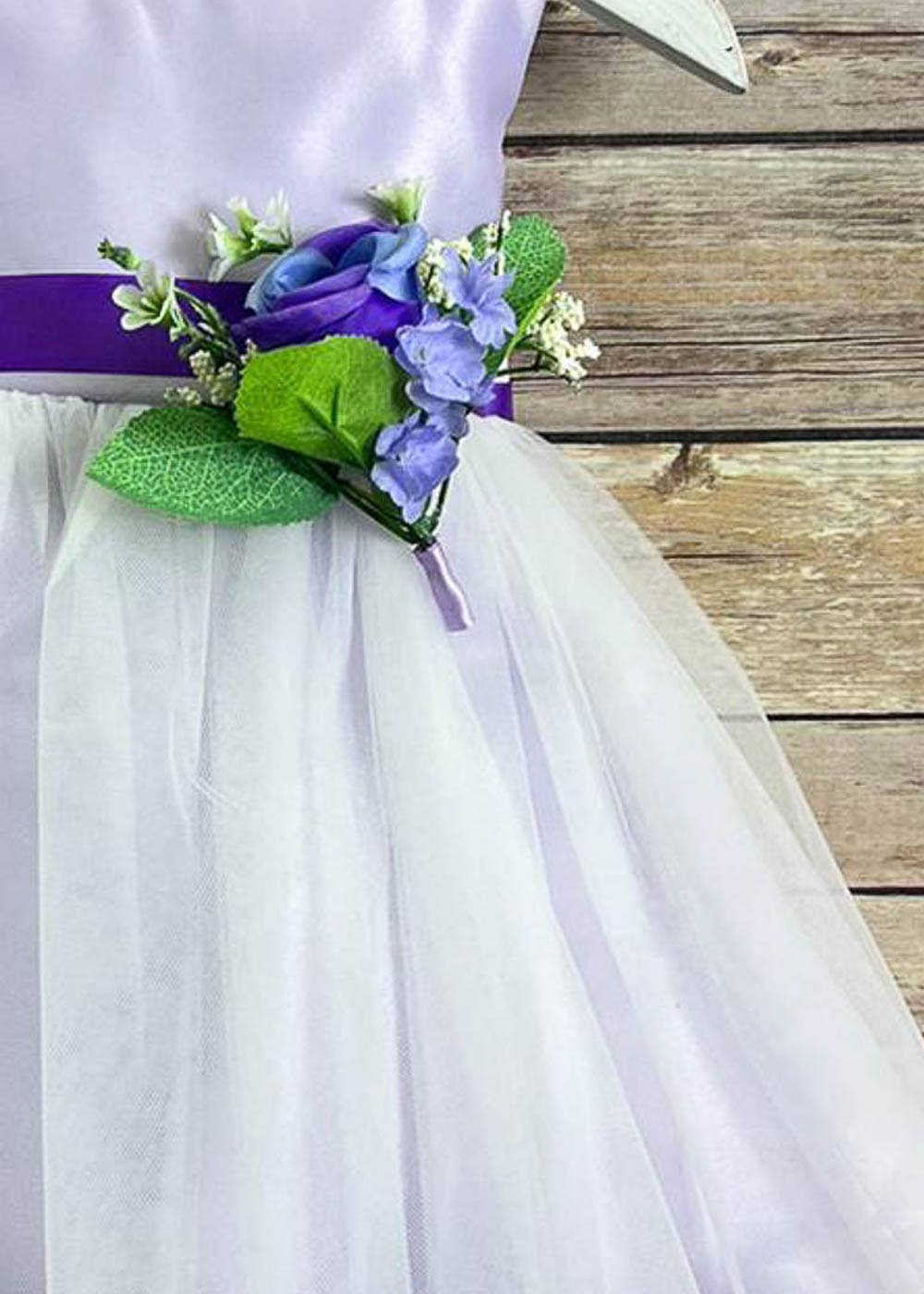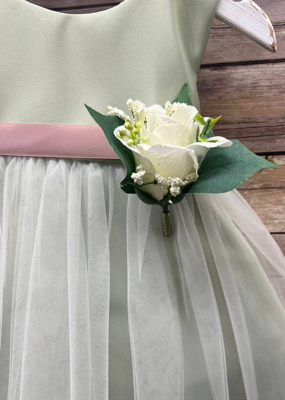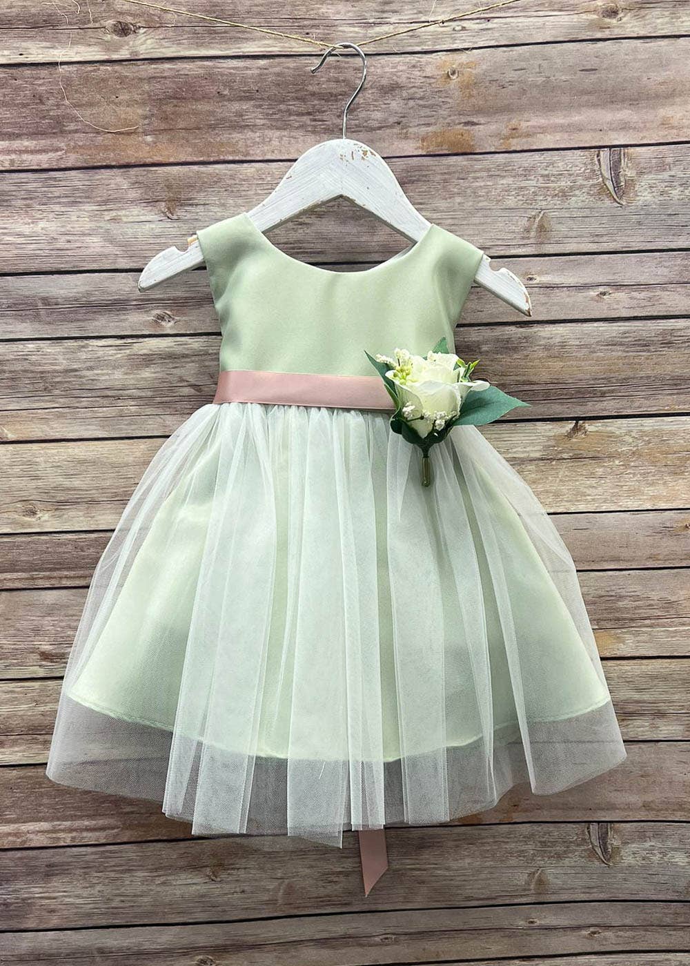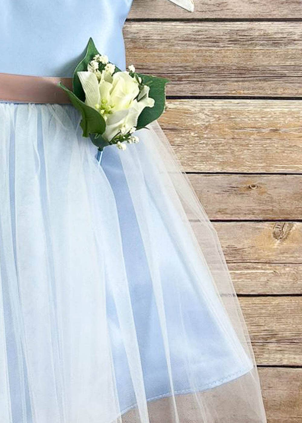 High Quality Dull Satin and Tulle dress with a satin sash & a beautiful pin-on bouquet to the side. Perfect Flower girl dress or Graduation dress. Satin top with tulle layered skirt. Tea-Length. Center back zipper. Fully lined. Additional netting under the skirt.