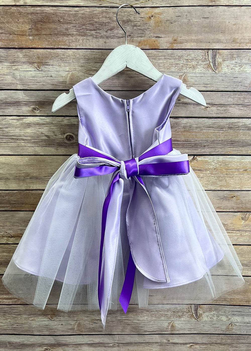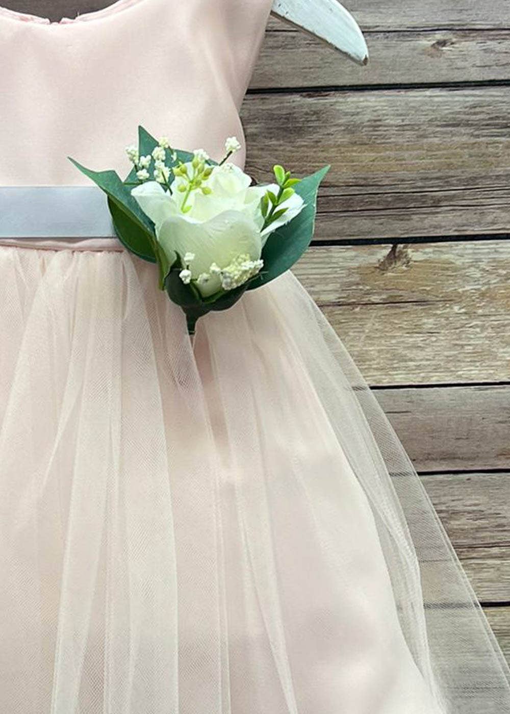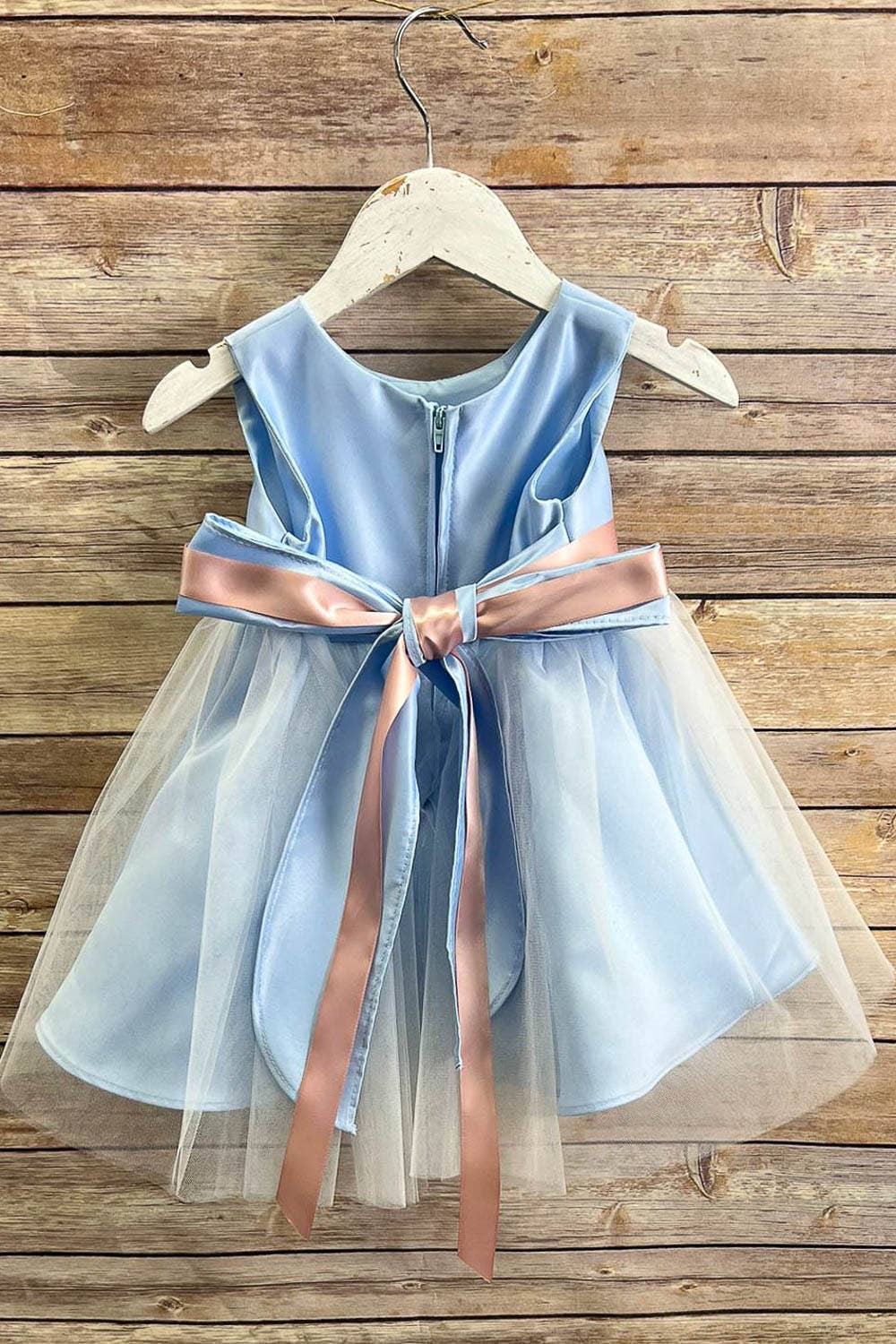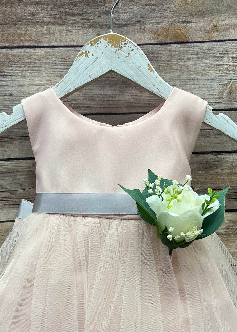 High Quality Dull Satin and Tulle dress with a satin sash & a beautiful pin-on bouquet to the side. Perfect Flower girl dress or Graduation dress. Satin top with tulle layered skirt. Tea-Length. Center back zipper. Fully lined. Additional netting under the skirt.