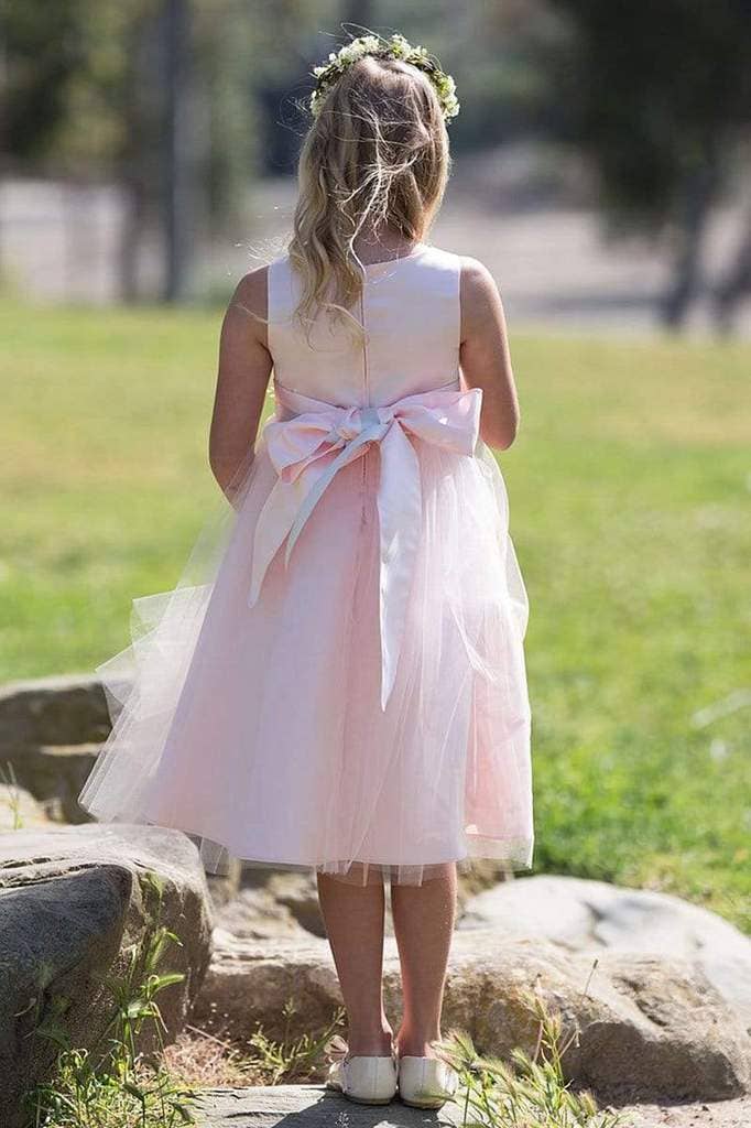 High Quality Dull Satin and Tulle dress with a satin sash & a beautiful pin-on bouquet to the side. Perfect Flower girl dress or Graduation dress. Satin top with tulle layered skirt. Tea-Length. Center back zipper. Fully lined. Additional netting under the skirt.