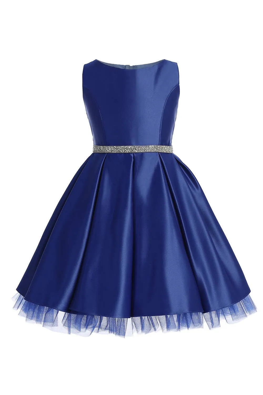Pleated satin skirt with peek a boo crystal tulle hem & rhinestone waist trim. Satin back band and zipper closure. Knee length.