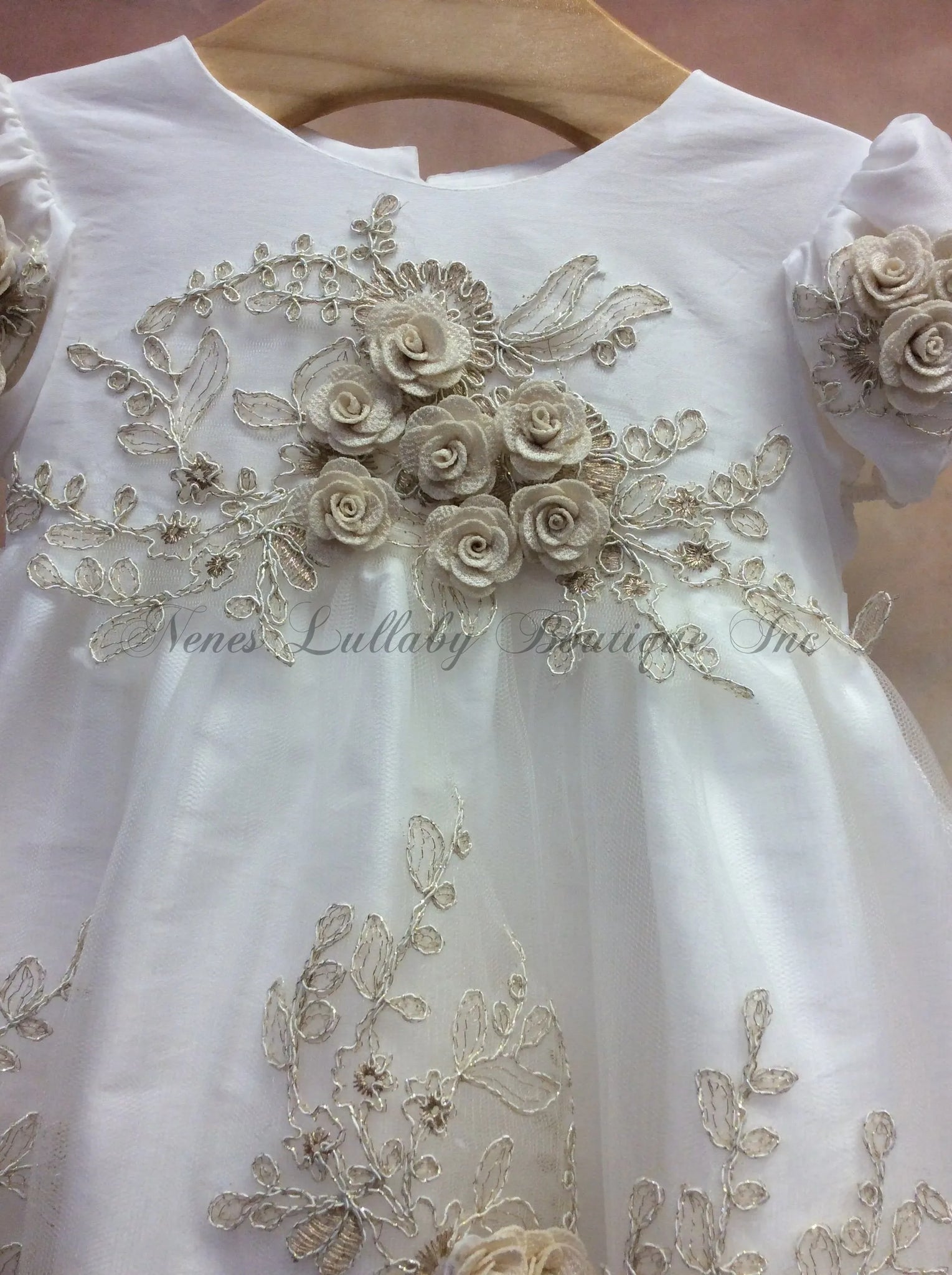 This luxurious Rose258IG_Long Christening Dress is sure to add a touch of elegance to your little one's special day. Crafted from Taffeta, it features a diamond white design with a rolled champagne 3D roses lace overlay, adding a soft touch. Paired with the matching bonnet, your little one will look picture perfect.