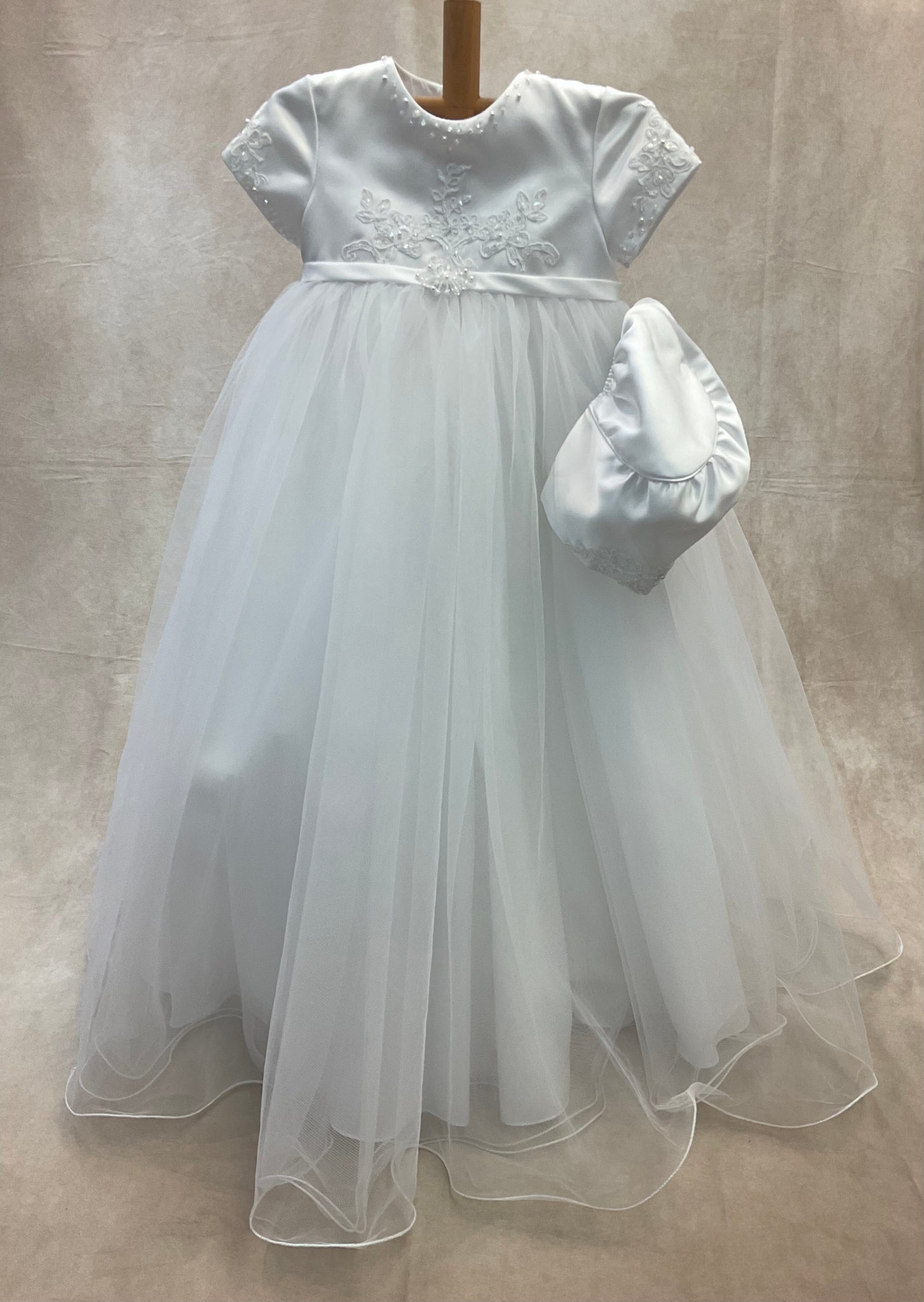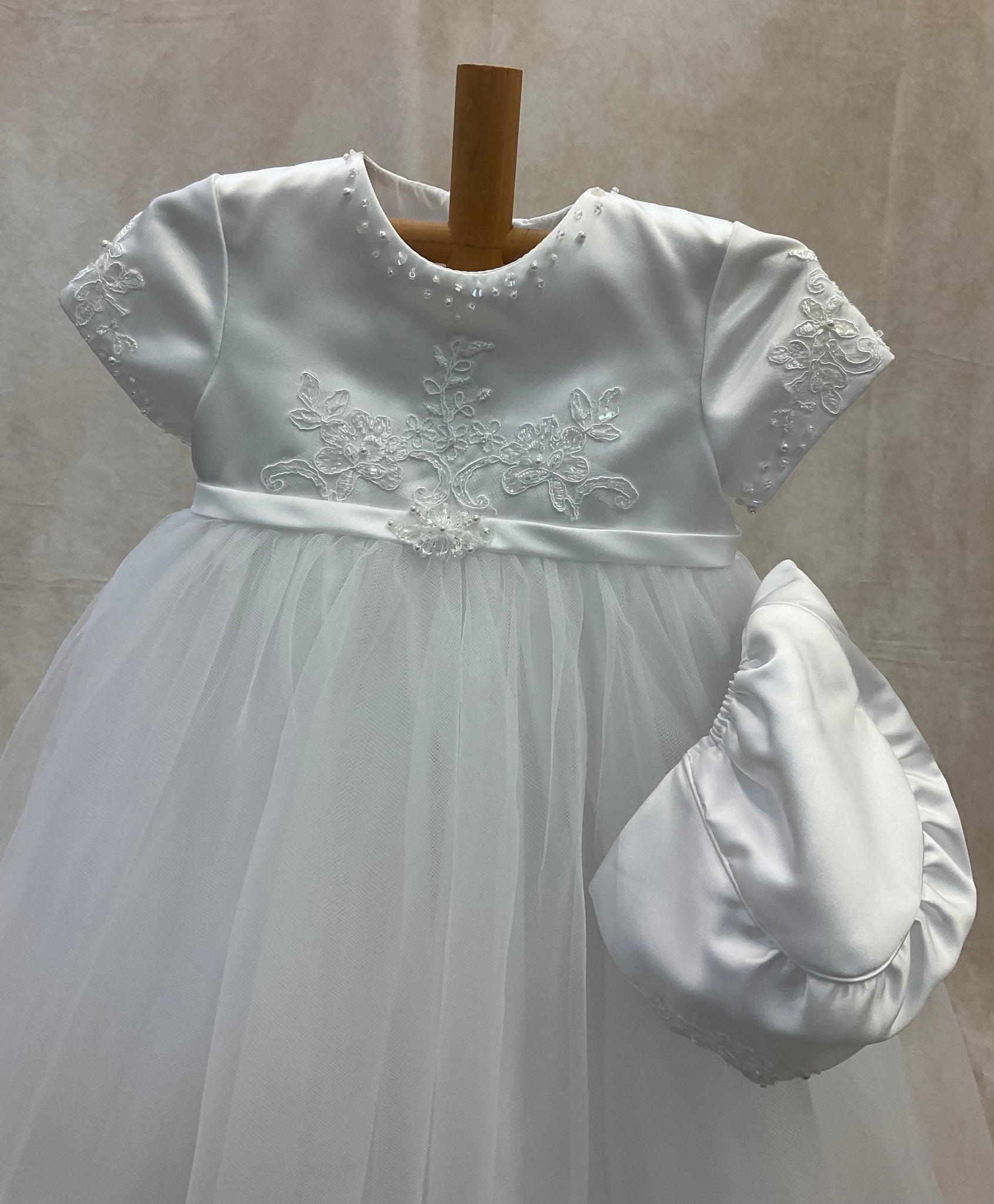 The Anna Maria Christening gown is made of Satin with lace & pearl aplique, large rounded tulle skirt comes with matching bonnet