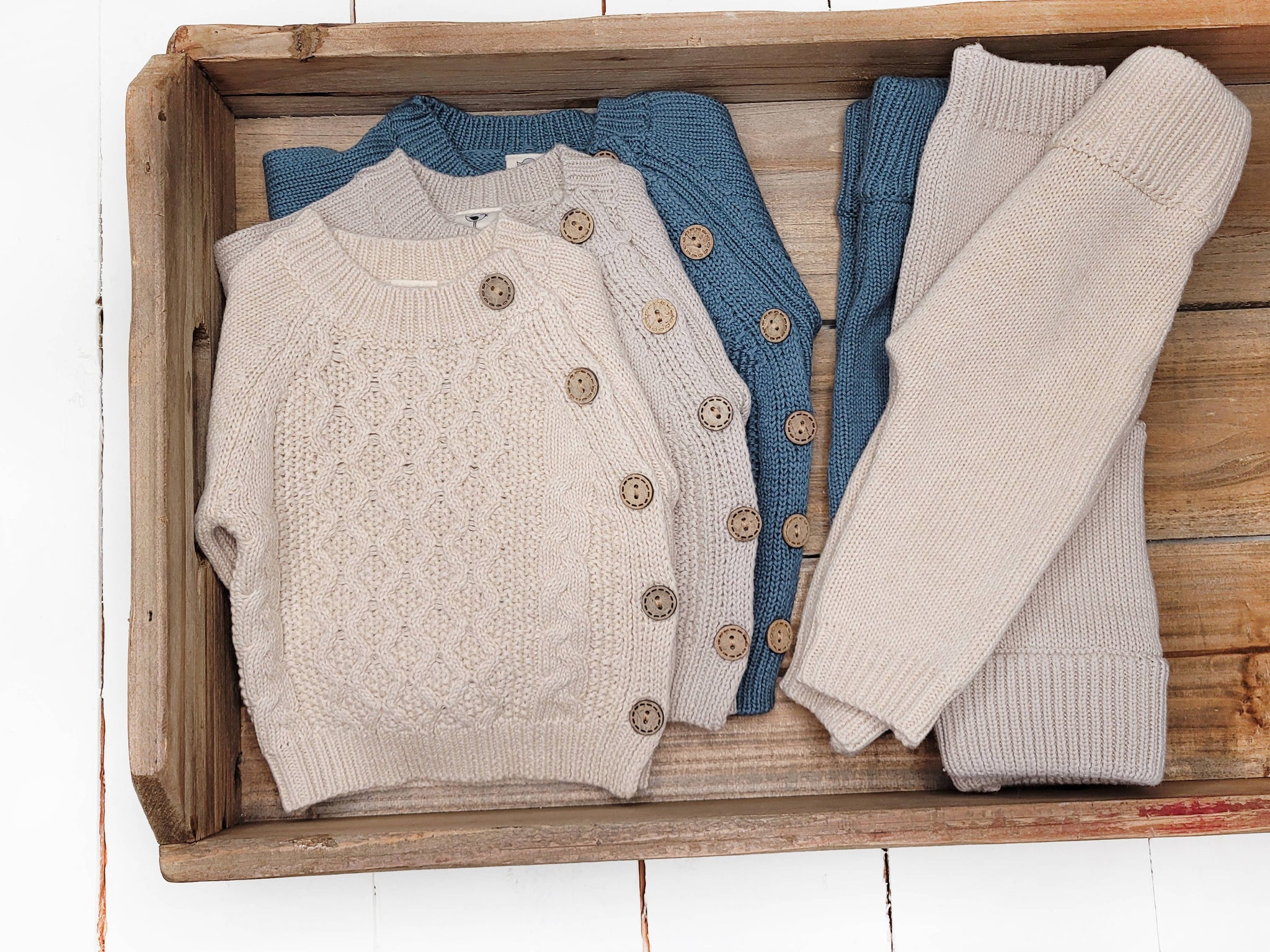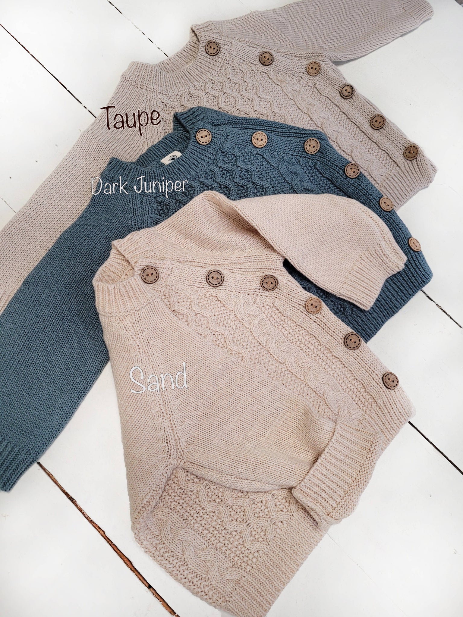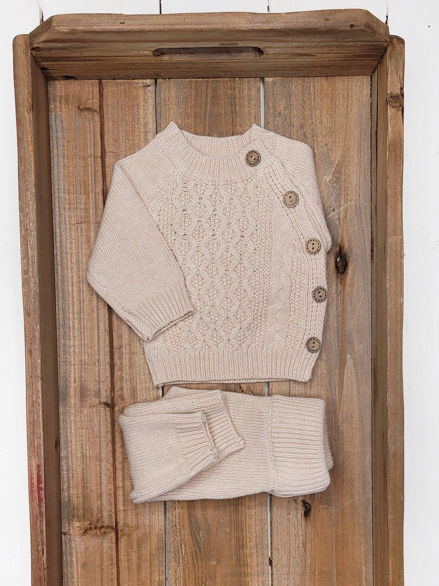 100% cotton knit 2 pc outfit with wooden button on a shirt, elastic band on pants and natural knit stretch. Available in gray, rustic brown, mauve. In sizes nb -18-24m.