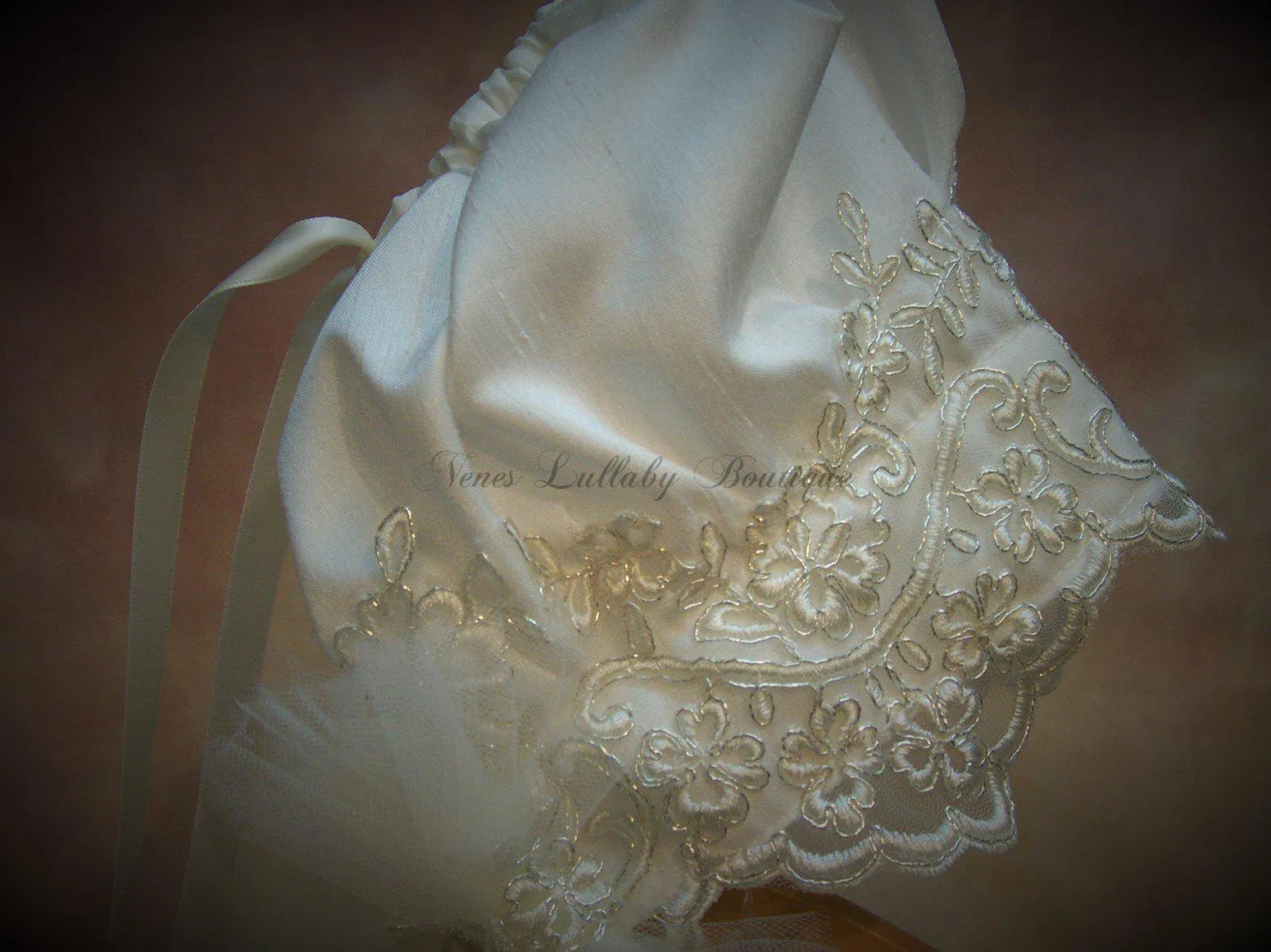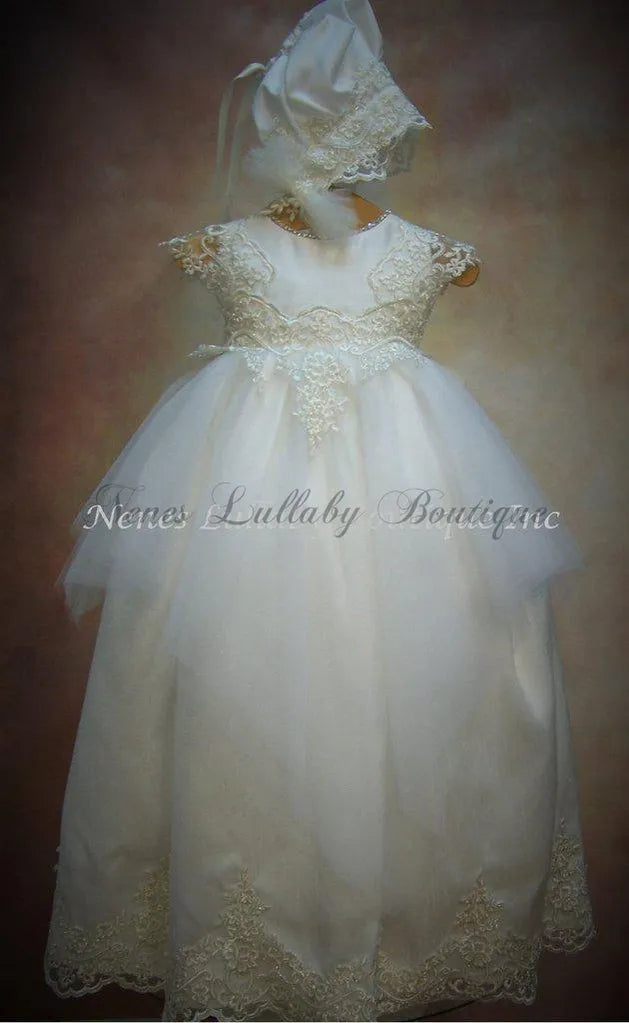 The Magdalena Christening Gown by Piccolo Bacio features delicate white silk and tulle, enhanced with elegant metallic lace detailing. This exquisite set includes a coordinating bonnet, perfect for your baby's special day. Discover this beautiful ensemble at www.neneslullabyboutique.com.