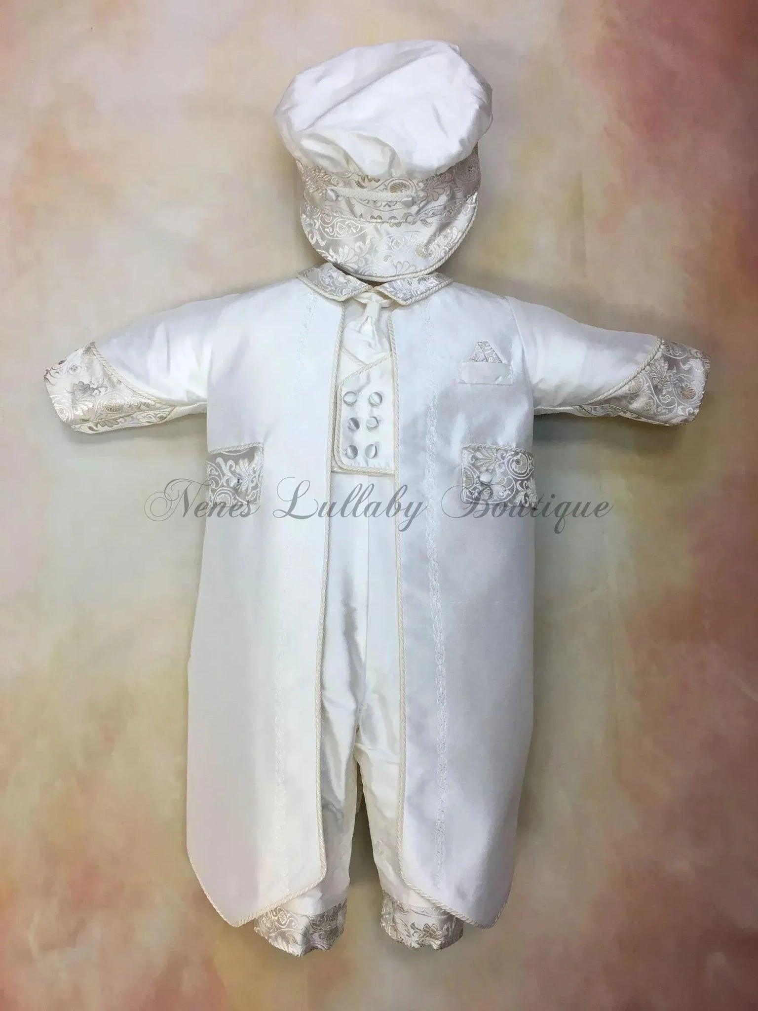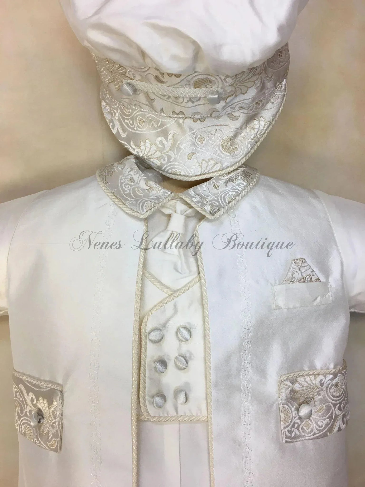 Piccolo Bacio Boys 100 % White Silk  Christening Suits with Gold Brocade Accent long jacket  & Long Pant matching rider cap